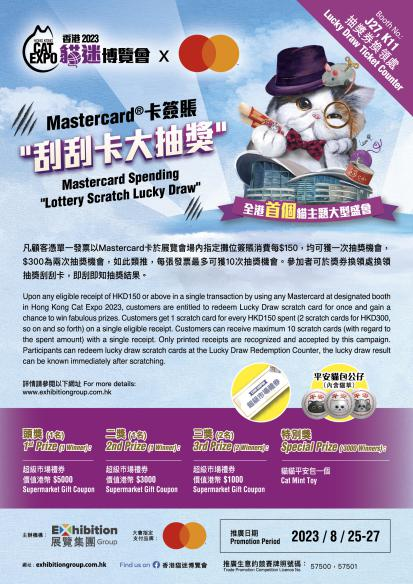 凡憑單一發票以Mastercard卡於展覽會場內指定攤位簽賬消費每$150,均可獲一次抽獎機會,$300為兩次抽獎機會,如此類推。每張發票最多可獲10次抽獎機會。參加者可於獎券換領處換領抽獎刮刮卡,即刮即知抽獎結果。
