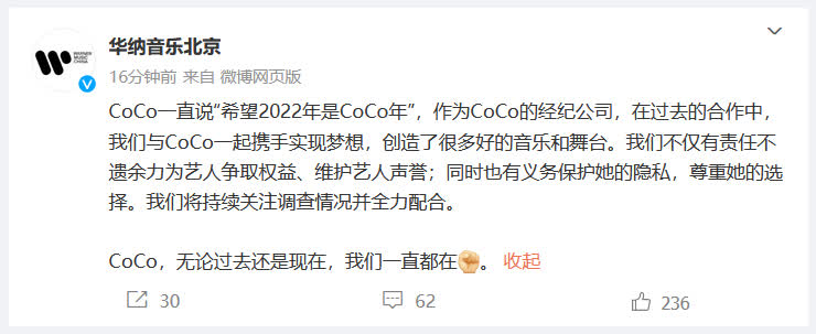 據觀察網報道,華納音樂北京今日(23日)在官方微博針對歌手CoCo李玟生前控訴錄音事件表示,作為CoCo的經紀公司,公司不僅有責任不遺余力為藝人爭取權益、維護藝人聲譽;同時也有義務保護她的隱私,尊重她的選擇。華納音樂稱,「我們將持續關注調查情況並全力配合。」