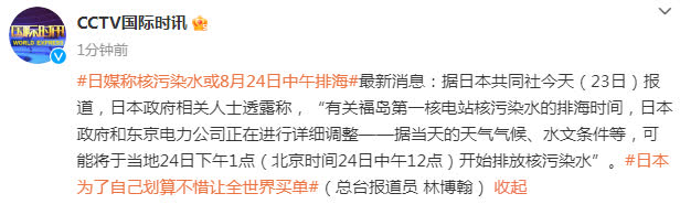 據CCTV國際時訊最新消息:據日本共同社今天(23日)報道,日本政府相關人士透露稱,「有關福島第一核電站核污染水的排海時間,日本政府和東京電力公司正在進行詳細調整——據當天的天氣氣候、水文條件等,可能將於當地24日下午1點(北京時間24日中午12點)開始排放核污染水」。