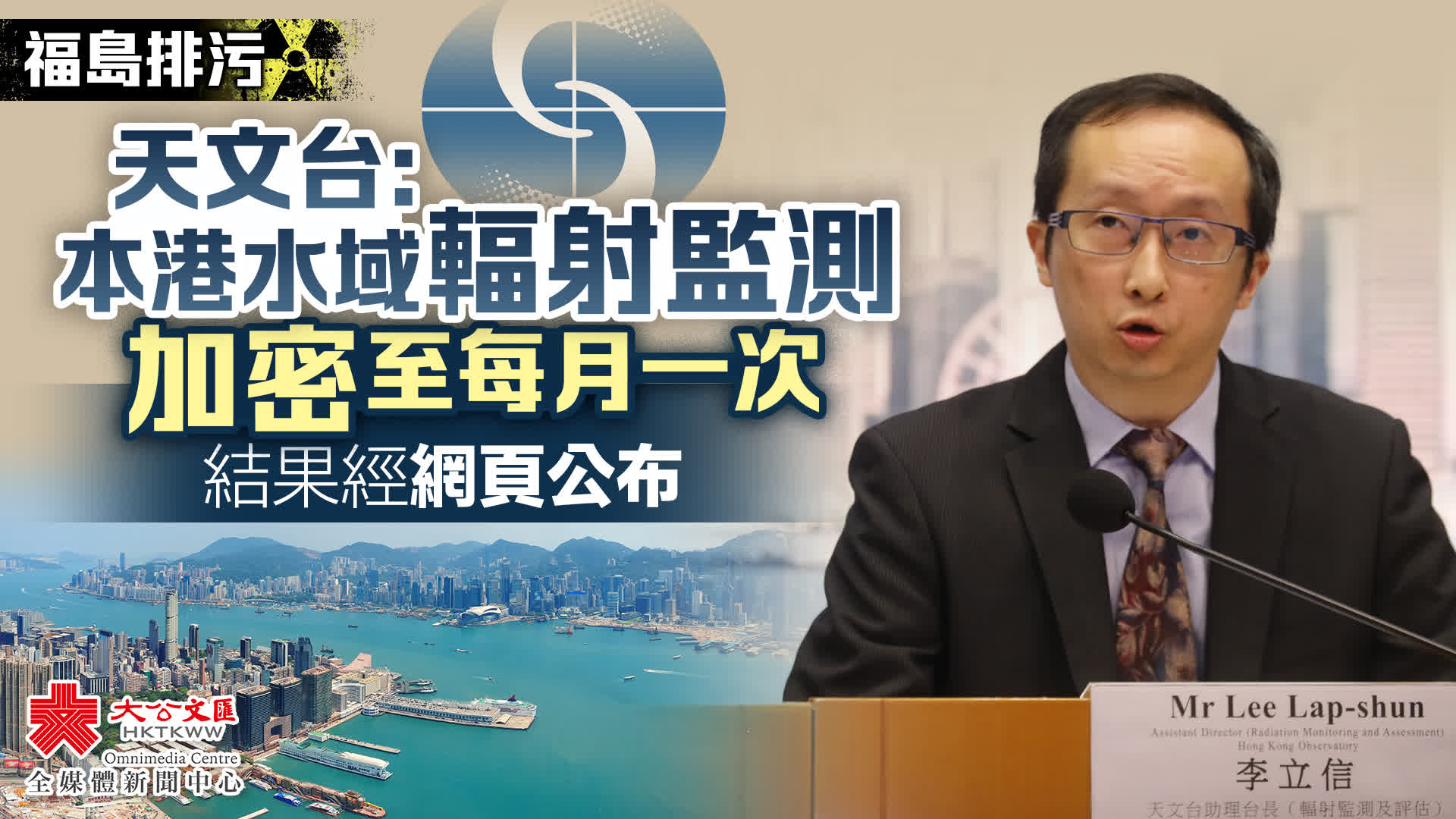 天文台助理台長李立信表示,香港天文台一直都有檢測香港環境輻射水平,每一季都會在本港水域抽取海水樣本測量其中氚、人工伽馬放射性核素的含量。因應本次日本福島核污水排放,天文台上個月已經開始加密本港海水樣本輻射監測,增加至每個月一次,會因應情況,調整次數。測量結果會透過天文台網頁公布。