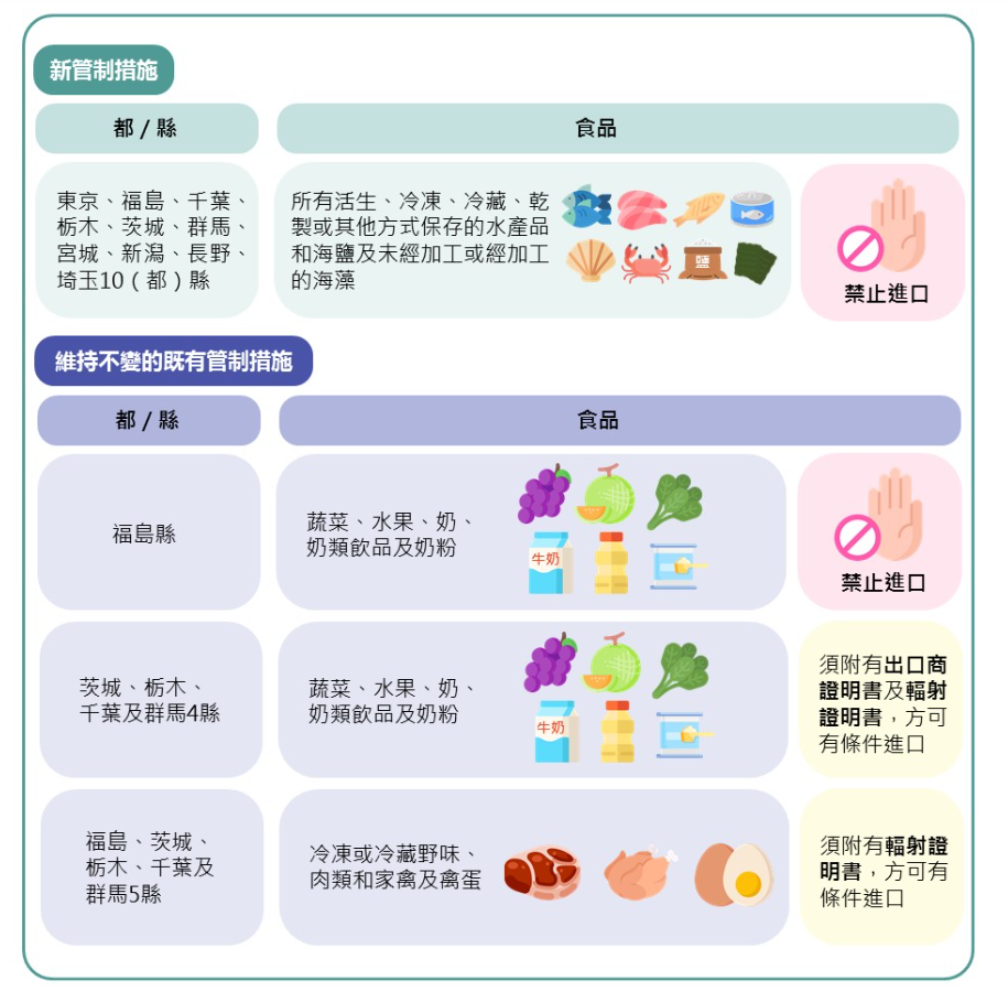 楊碧筠補充,政府會維持現行針對日本進口食品的管制措施,禁止所有源自福島縣的蔬菜、水果、奶、奶類飲品及奶粉入口。源自福島縣附近四個縣的食品,即茨城、栃木、千葉及群馬,則必須附有由日本主管當局發出的輻射證明書及出口商證明書,才可進口。至於所有源自上述五個縣的冷凍或冷藏野味、肉類和家禽、禽蛋須附有日本主管當局所簽發的輻射證明書,證明有關食物的輻射水平沒有超出食品法典委員會的指引限值,否則亦禁止輸入本港。