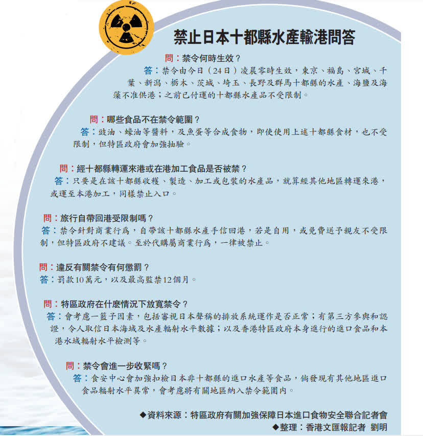 香港特區政府刊登憲報,由今日凌晨零時起,禁止來自日本東京、福島、千葉等10個都縣的水產品(包括海鹽、海藻等)進口香港(見表),任何人違反命令,可被判罰款10萬元及監禁12個月。其他未有被禁止輸入香港的日本水產品、海鹽等,食安中心亦會全面進行輻射水平測試,在確認相關產品沒有超出輻射水平的情況下才允許於市場供應。