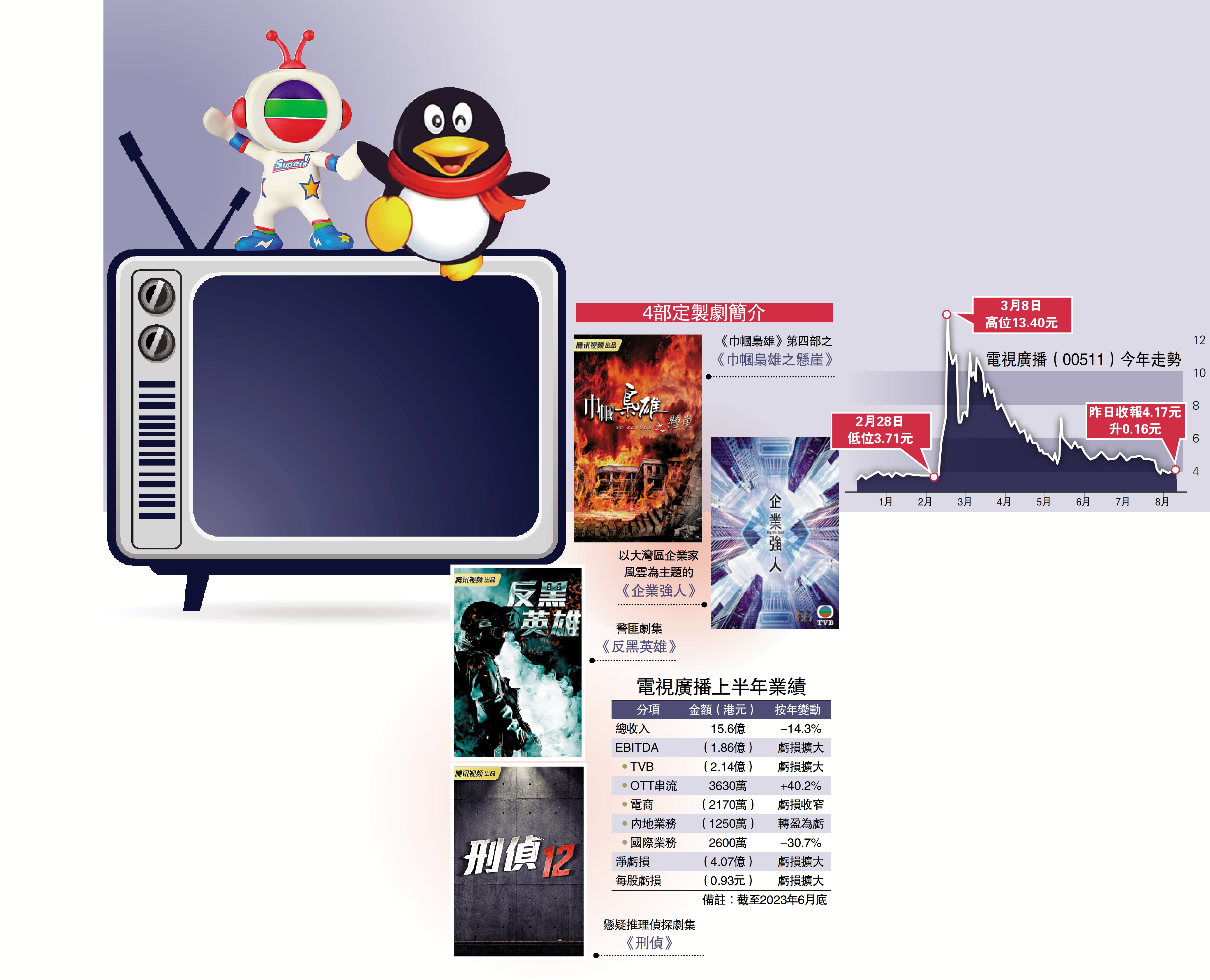 電視廣播(00511)昨日公布兩項消息,其一是收市後公布業績虧損擴大至逾4億元,不過公司早前發盈警,市場早已預料業績有多差。其二是昨日早上公布與騰訊視頻旗下企鵝影視合作拍劇,並將舊劇集在騰訊視頻上播放,股價升4%,反映市場認同。