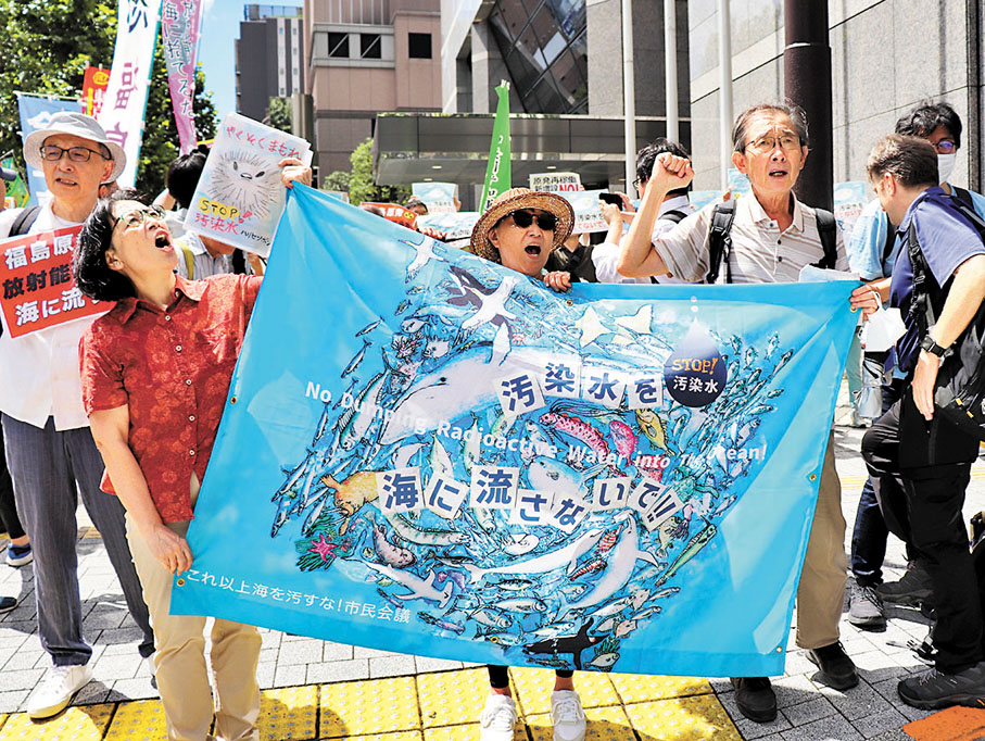 日本市民團體組成的「再見核電站—千萬人行動執行委員會」大批成員,周四聚集在東電總部門前,舉起寫有「不要弄髒生命之海」等標語,高呼不要排放核污水等口號,堅決反對日方的排海計劃。參與集會的民眾還要求日本政府和東電立即撤銷排海的錯誤決定,不要將核污染風險轉嫁給海洋甚至全人類。不少人還用咪高峰接力喊話,批評「政府違背了與民眾的約定、東電污染大海,不會受良心譴責嗎?」