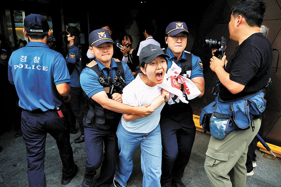 韓國學生團體「進步大學生網」部分成員,周四亦前往首爾的日本駐韓大使館舉行記者會,抗議核污水排海計劃。更有十多名學生在會後闖入大使館所在大樓,舉起寫有「大海不是日本的垃圾桶」等標語,聚集在位於2樓的大廳和8樓的使館辦公室門外,並試圖闖入位於9樓的大使館,共有16名學生被捕。