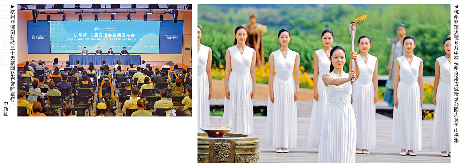 大公報綜合新華社、中新社報道:24日,杭州亞運會倒計時30天新聞發布會在主媒體中心新聞發布廳舉行。記者從發布會上獲悉,亞運火炬傳遞將於9月8日在杭州啟動並在浙江省11個地市進行傳遞,並於9月20日回到杭州。參與火炬傳遞的火炬手共2022名,年齡最小的14歲,最大為84歲。首金將於開幕次日即9月24日上午產生。