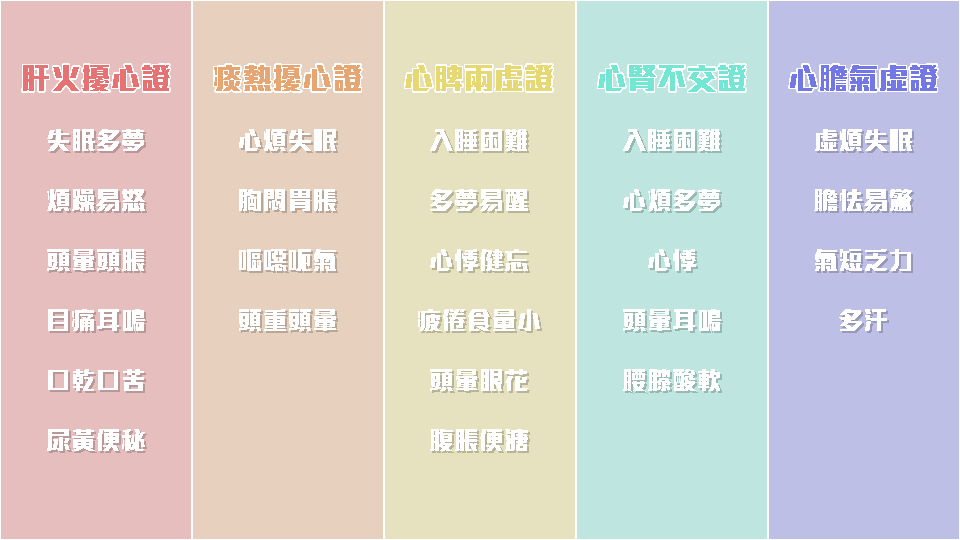 中醫治療失眠,或為失眠患者提供解決方法時,大致將患者的體質分為5個證型: