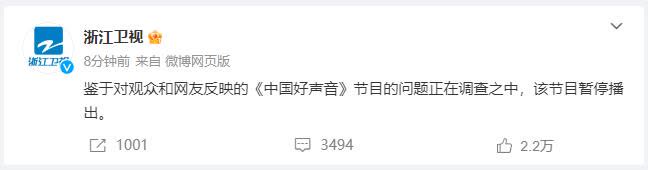 8月25日,@浙江衛視 稱,鑒於對觀眾和網友反映的《中國好聲音》節目的問題正在調查之中,該節目暫停播出。