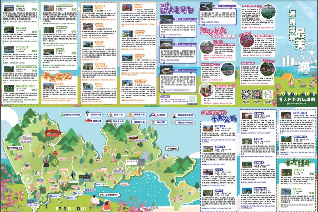 此外,繁體版《遇見深圳最美山海 港人戶外遊玩攻略》宣傳折頁,將深圳公園、綠道、書吧等以手繪插畫的形式一目了然地展示出來,方便港人閱讀。該折頁將於近日在福田口岸、皇崗口岸、羅湖口岸、深圳灣口岸、蓮塘口岸等五大口岸投放,為香港同胞來深遊玩提供便民資訊。