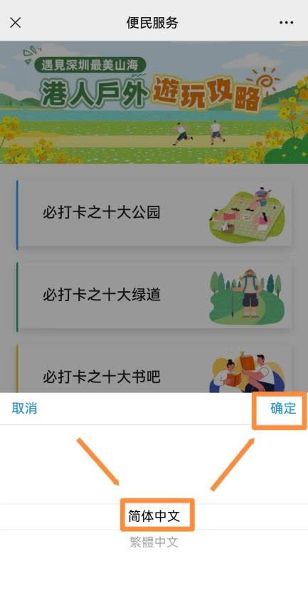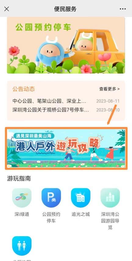 1.市民遊客可通過「美麗深圳」微信公眾號「便民服務」欄目中的「港人戶外遊玩攻略」進行訪問。