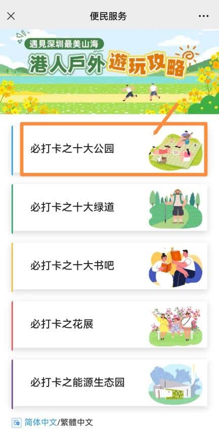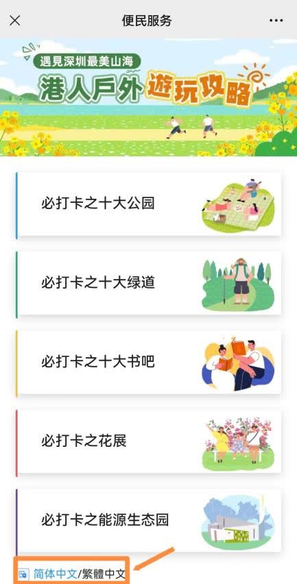 香港遊客只需打開「美麗深圳」微信公眾號,點擊「便民服務」欄目中的「港人戶外遊玩攻略」即可一鍵直達,還能一鍵查詢到最便捷的口岸交通路線,進行「預約停車、線路導航、一鍵預約」等。欄目中還可進行「簡體中文、繁體中文」切換,以及查看更詳盡的專題介紹。