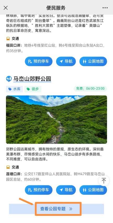 3.「必打卡之十大公園」中可以查閱到十大公園的詳細信息,以及可以進行便民預約停車、路線導航、查看公廁地圖,欄目下方可點擊「查看公園專題」查看更多公園遊玩信息。