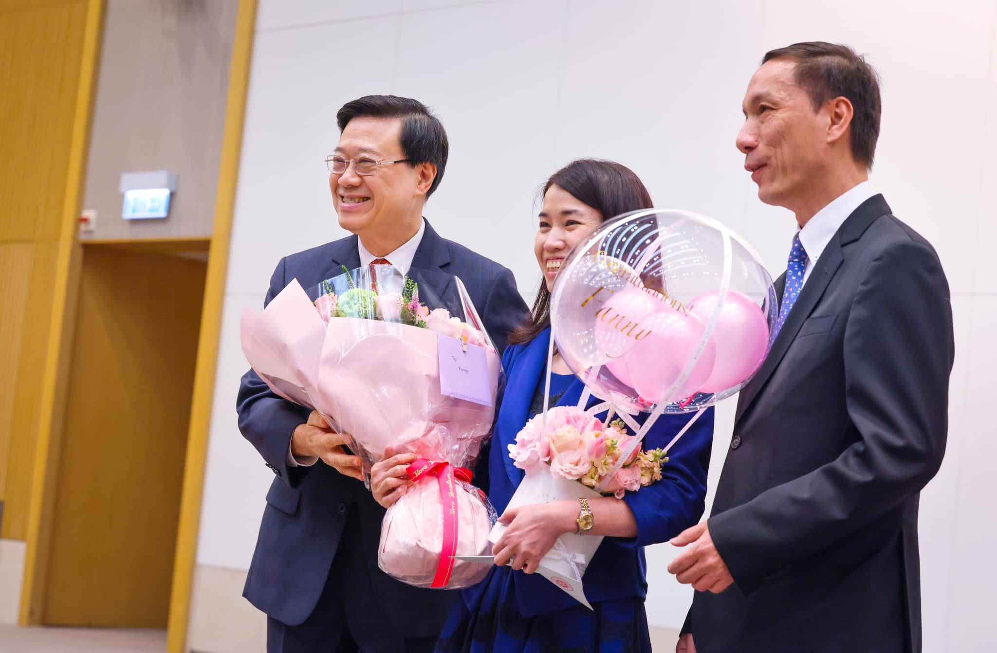 李家超說,自從上任特首後,每天都有大大小小的工作要處理,全靠秘書作後盾全力支援,才能全心全意專注投入工作,實在非常感謝她!亦感謝同事們過往付出的努力,再次祝賀各位升職,未來工作順利!