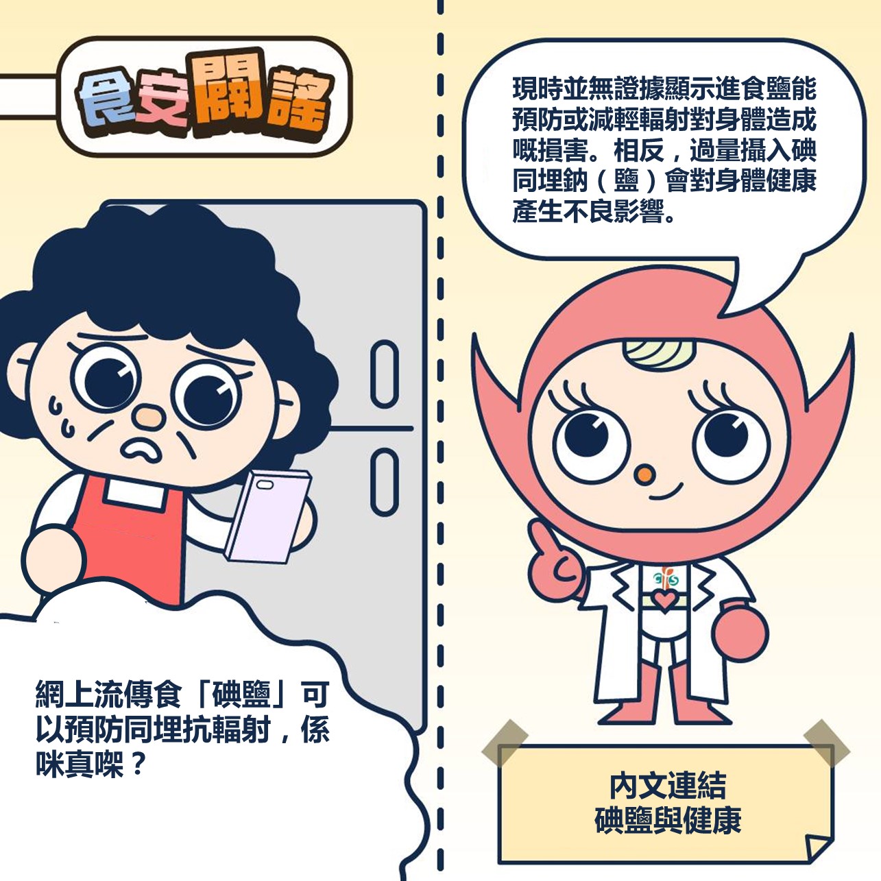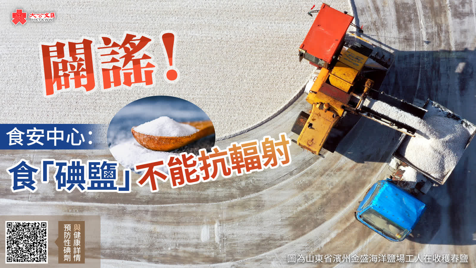 帖文指出,碘鹽的碘含量低,每日起碼要食大約2.5至5公斤,才相當於一粒碘片的劑量。相反,過量攝入碘及鈉(鹽)會危害身體健康。碘片非輻射「解毒劑」,亦不能夠阻止身體吸收碘以外的放射性物質。