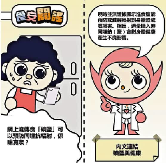 網上流傳吃「碘鹽」可以抗輻射,食物安全中心澄清,無科學證據顯示進食鹽能夠預防輻射,過量攝入碘及鈉(鹽),反而會危害身體健康。