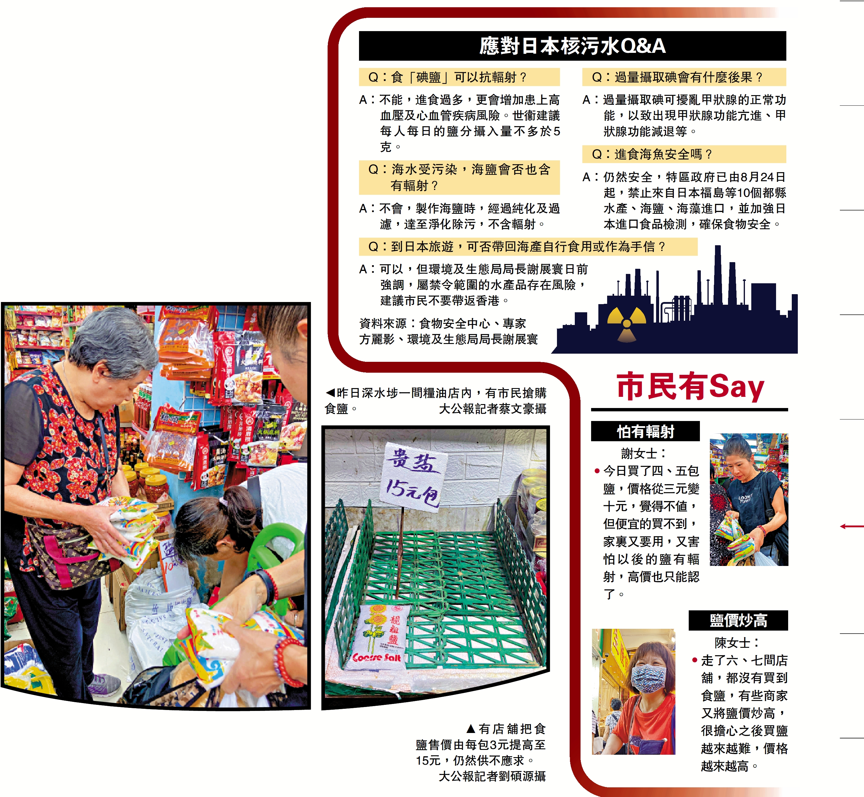 有市民見到售價後驚呼「好貴」,但還是無奈買鹽,短短10分鐘,補貨的食鹽也賣清。買了兩包鹽的李婆婆說,10元一包鹽實在買得不值,但擔心「以後食鹽等於食輻射入肚」,唯有高價囤鹽,她擔心漲價情況持續,憂慮鹽價「有漲無落」。