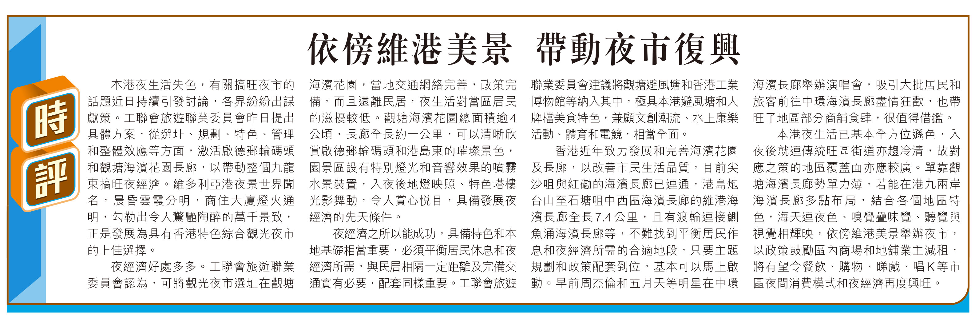 本港夜生活已基本全方位遜色,入夜後就連傳統旺區街道亦趨冷清,故對應之策的地區覆蓋面亦應較廣。單靠觀塘海濱長廊勢單力薄,若能在港九兩岸海濱長廊多點布局,結合各個地區特色,海天連夜色、嗅覺疊味覺、聽覺與視覺相輝映,依傍維港美景舉辦夜市,以政策鼓勵區內商場和地舖業主減租,將有望令餐飲、購物、睇戲、唱K等市區夜間消費模式和夜經濟再度興旺。