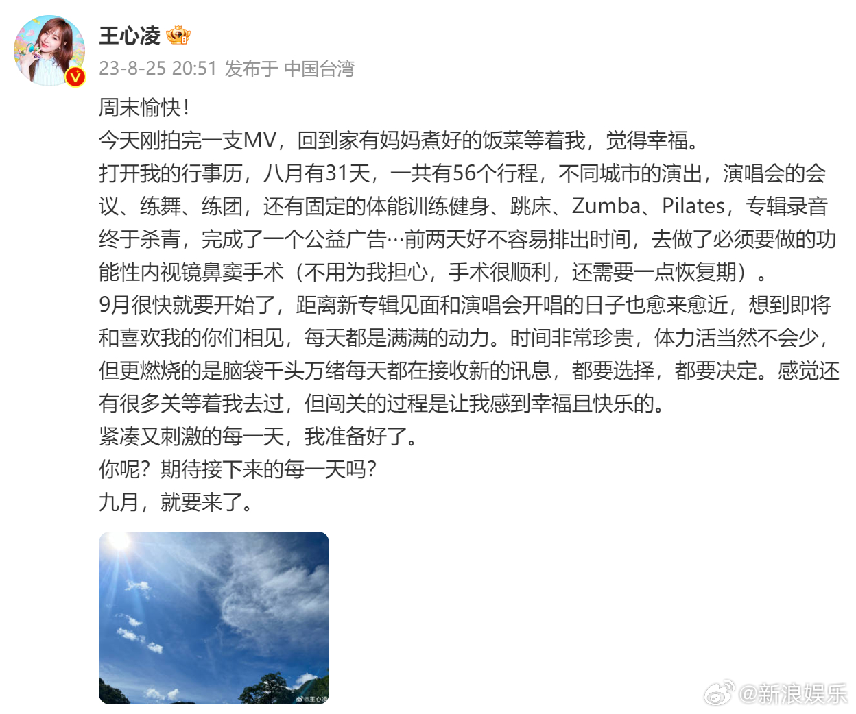 大公文匯全媒體報道,台灣藝人王心凌25日晚發文分享近況,透露在8月的31天裏安排有56個行程,包括演出、會議、練舞、練團、體能訓練等,更直言「前兩天好不容易排出時間,去做了必須要做的功能性內視鏡鼻竇手術」。