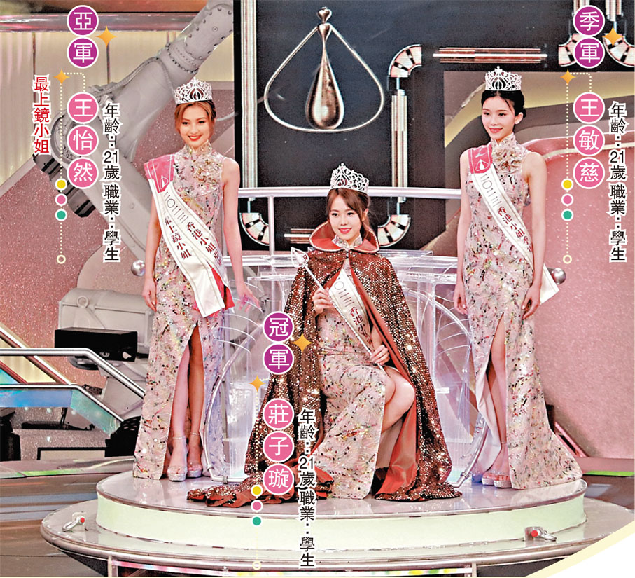 (香港文匯報記者 達里、子棠、梁靜儀,攝影 彭子文)無綫一年一度選美盛事《2023香港小姐競選》決賽,昨晚於將軍澳電視城隆重舉行,TVB緊貼科技潮流,以人工智能融入港姐選美,安排史上第一位AI港姐司儀,並用AI生成佳麗理想中的自己,與未來的AI老人版自己「時空對話」,以及問答環節上,也透過AI技術,打造個人化題目,增加挑戰性,讓佳麗比美也比智慧。最終由15號莊子璇以淡定得體表現大熱奪冠,4號王怡然得亞軍及「最上鏡小姐」,成為雙料得主,而季軍佳麗是17號王敏慈。今年港姐冠軍后冠史無前例加入紅寶石元素,加上全新設計,冠亞季后冠總值300萬。
