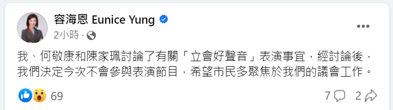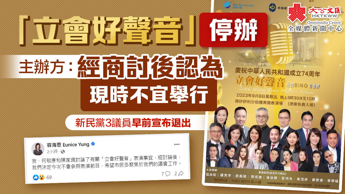 另外,在主辦方宣布活動取消前,新民黨立法會議員容海恩今日中午已在社交平台發文,指與黨友何敬康、陳家珮商討後,決定3人都不會參與今次表演節目,「希望市民多聚焦於我們的議會工作。」