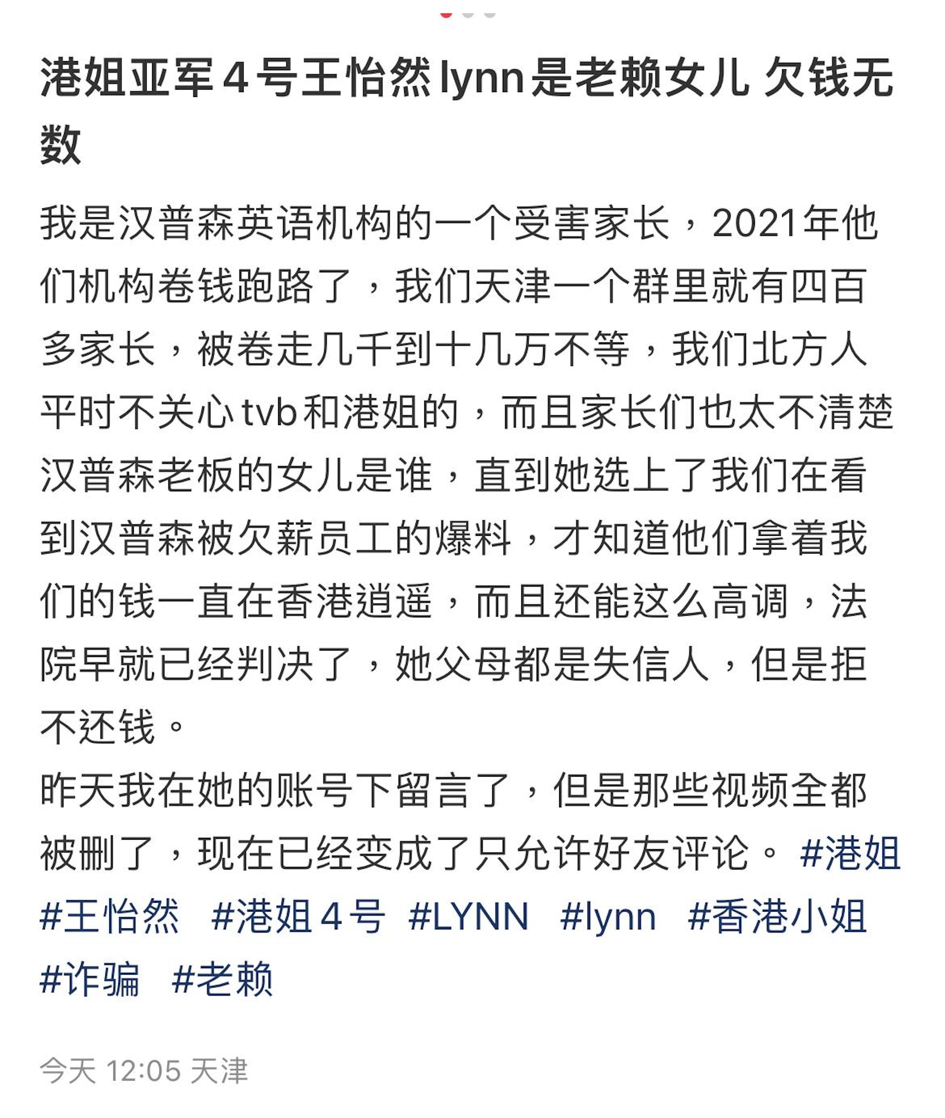有內地網民在社交平台爆王怡然父母大鑊,指控其雙親是內地「補習天王」,於10多個城市經營補習社,不過拖欠員工工資及騙取學費,苦主勝訴都得不到賠償,舉家捲款逃去香港。另有網友稱,王怡然父母經營的培訓機構已經倒閉,共欠數千萬人民幣後「走佬」。有苦主不滿無綫沒做好家庭背景審查,讓疑「騙財家庭」的女兒王怡然奪獎,望無綫主持公道,如查明屬實後,應褫奪其亞軍名銜。