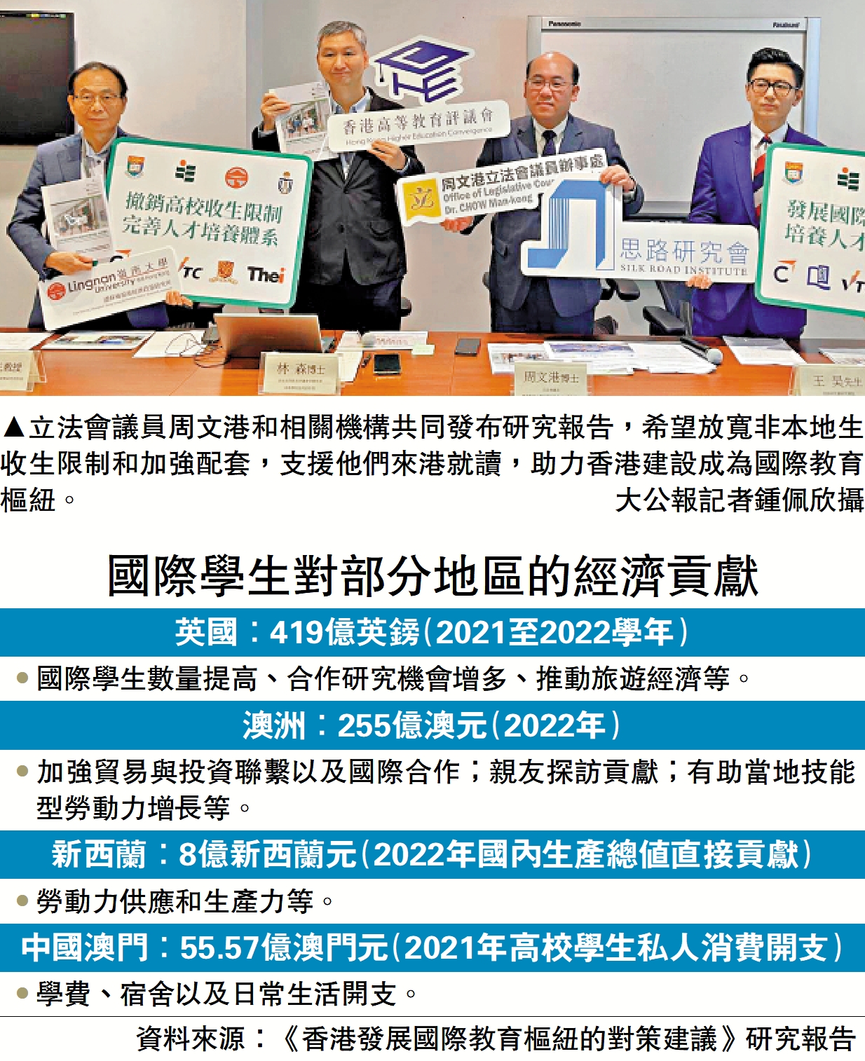(大公報 記者 鍾佩欣)香港擁有良好高等教育基礎的優勢,特區政府正在探討發展和鞏固香港成為國際高等教育區域樞紐。立法會議員周文港聯同智庫機構與教育界發表研究報告,認為現時高等教育的非本地生收生不足,建議放寬收生限制,加強校內及住宿配套,為本港未來發展培養人才,增強國際競爭力。