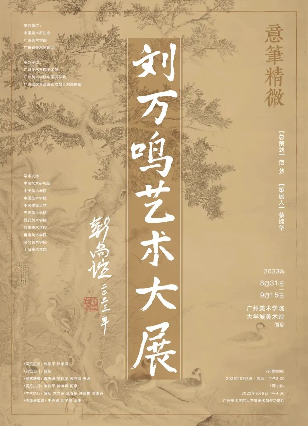 8月31日至9月15日,由中國美術家協會、廣州美術學院、廣東省美術家協會主辦,廣州美術學院美術館、廣州美術學院中國畫學院、廣州國家青苗畫家培育計劃課題組承辦的「意筆精微——劉萬鳴藝術大展」在廣州美術學院美術館一層1、2、3、4號展廳(廣州市番禺區大學城外環西路168號)開展。展覽將於9月8日(周五)下午2:30開幕,並於9月8日下午4:00-6:00在廣州美術學院大學城美術館多功能廳)舉辦研討會。範勃為總策劃,策展人蔡擁華。本次展覽展出近300件作品,全面展現劉萬鳴的藝術風貌及藝術活動經歷。