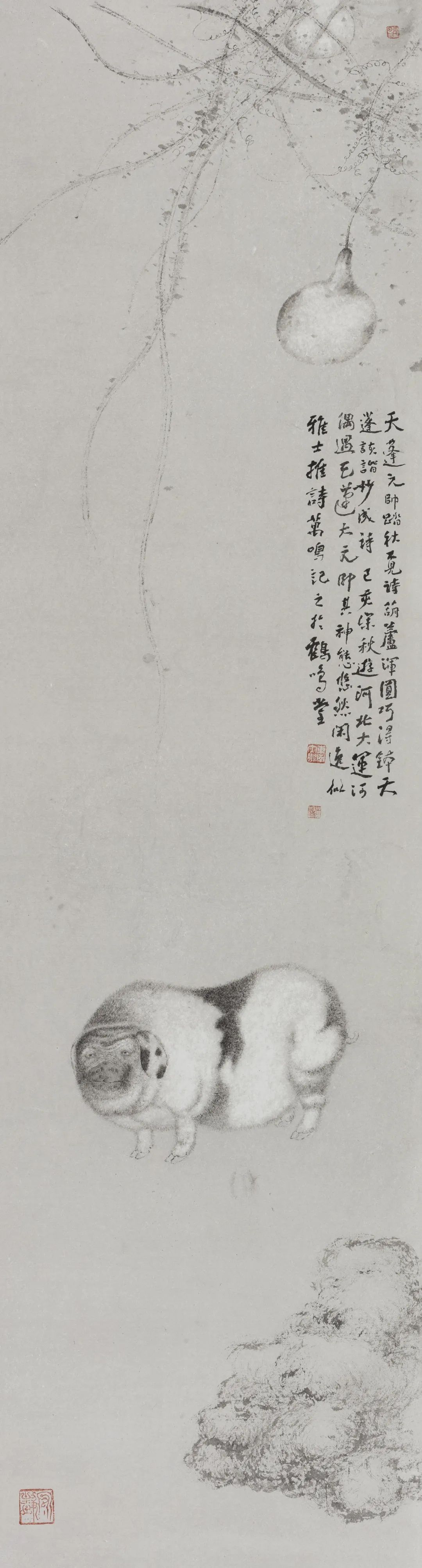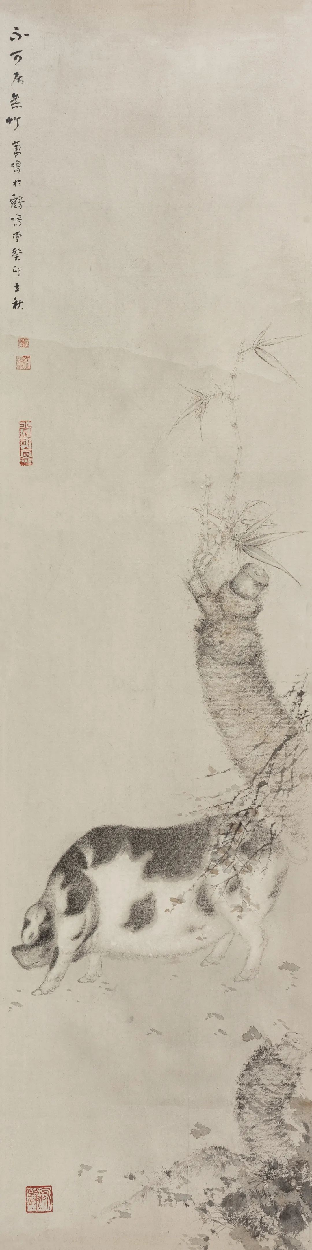 「萬鳴畫花鳥、走獸、人物,尤喜畫豬,我看到他畫了幾十幅豬圖。萬鳴畫豬,一是把古人不畫豬這個空白充實起來,二是他不忘本根。他生於農村,少時見到豬是常事,農家沒有不養豬的,他對豬有特殊的感情。他畫的豬也不同於齊白石、徐悲鴻等。他也是用元法化宋之法加之他自己的短戳筆法而畫成,萬鳴畫的豬,不但畫出豬之形狀,豬之精神,更畫出各種豬的特色和性情。這不僅是他的功力所致,也是他愛豬的精神所致。時人有曰:「齊白石的蝦,徐悲鴻的馬,黃胄的驢,李可染的牛,劉萬鳴的豬。」陳傳席在前言中如此寫道。