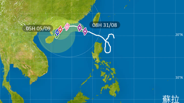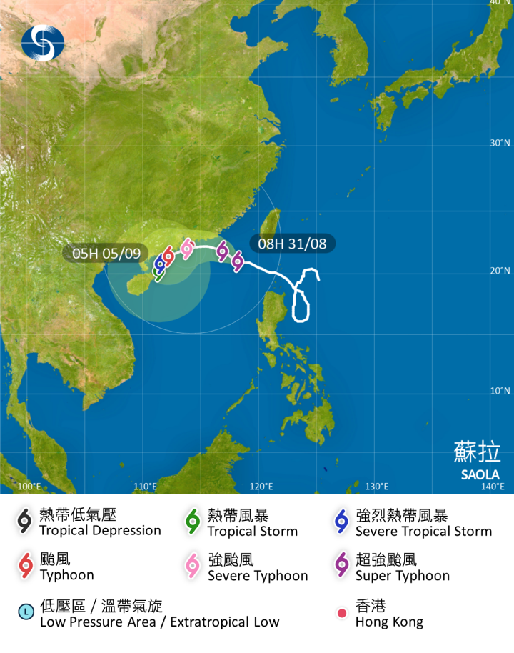 天文台指,在上午8時,超強颱風蘇拉集結在香港之東南偏東約440公里,即在北緯21.0度,東經118.2度附近,預料向西北偏西移動,時速約10公里,橫過南海東北部,移向廣東東部沿岸。按照現時預測路徑,蘇拉會在明日(9月1日)至後日(9月2日)相當接近珠江口一帶,本港天氣將會轉壞,有狂風大驟雨,蘇拉亦會為沿岸低窪地區帶來風暴潮。
