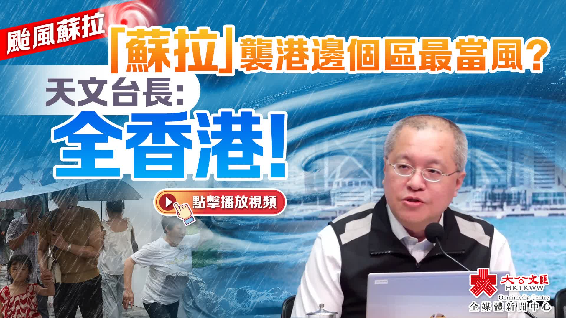大公文匯全媒體報道,超強颱風「蘇拉」逼近香港,特區政府今日(31日)下午召開跨部門記者會,交代政府應對颱風的工作。有記者問到「蘇拉」來襲香港哪個區域最當風,天文台台長陳栢緯回應指,由於「蘇拉」距離香港實在太近,根據現在預測,全港所有地區風力都可以很大,離岸和高地風力會更高。