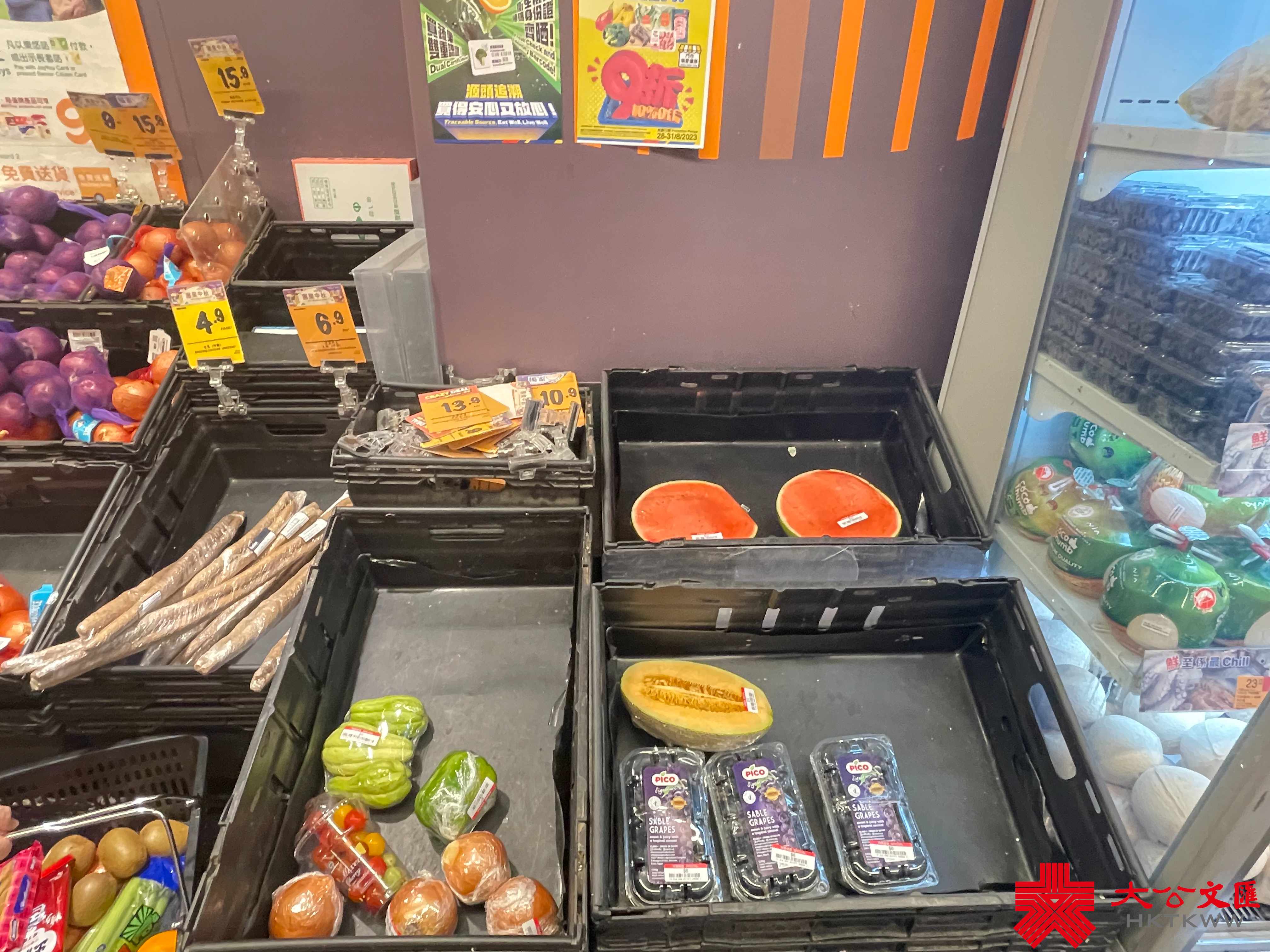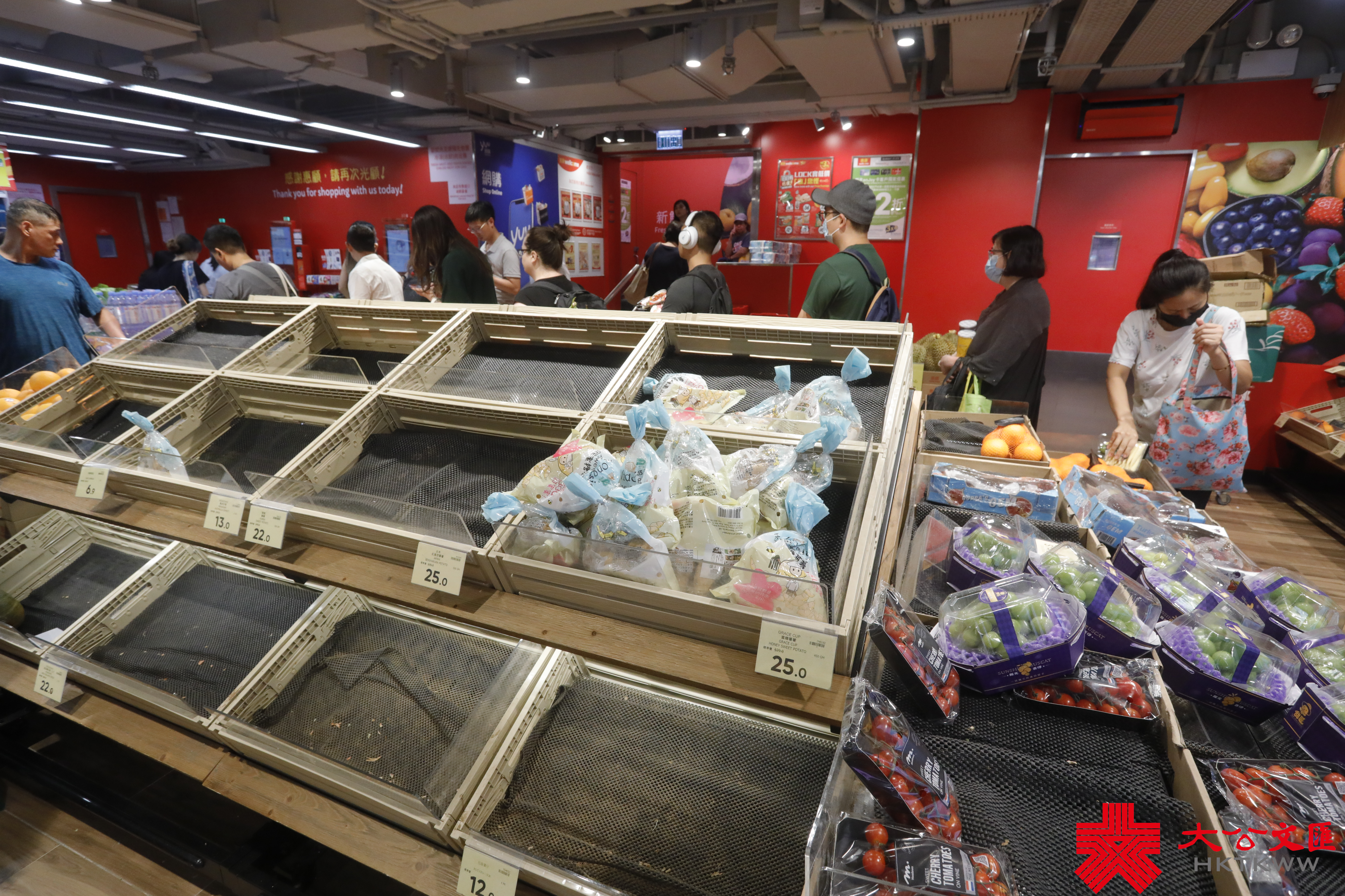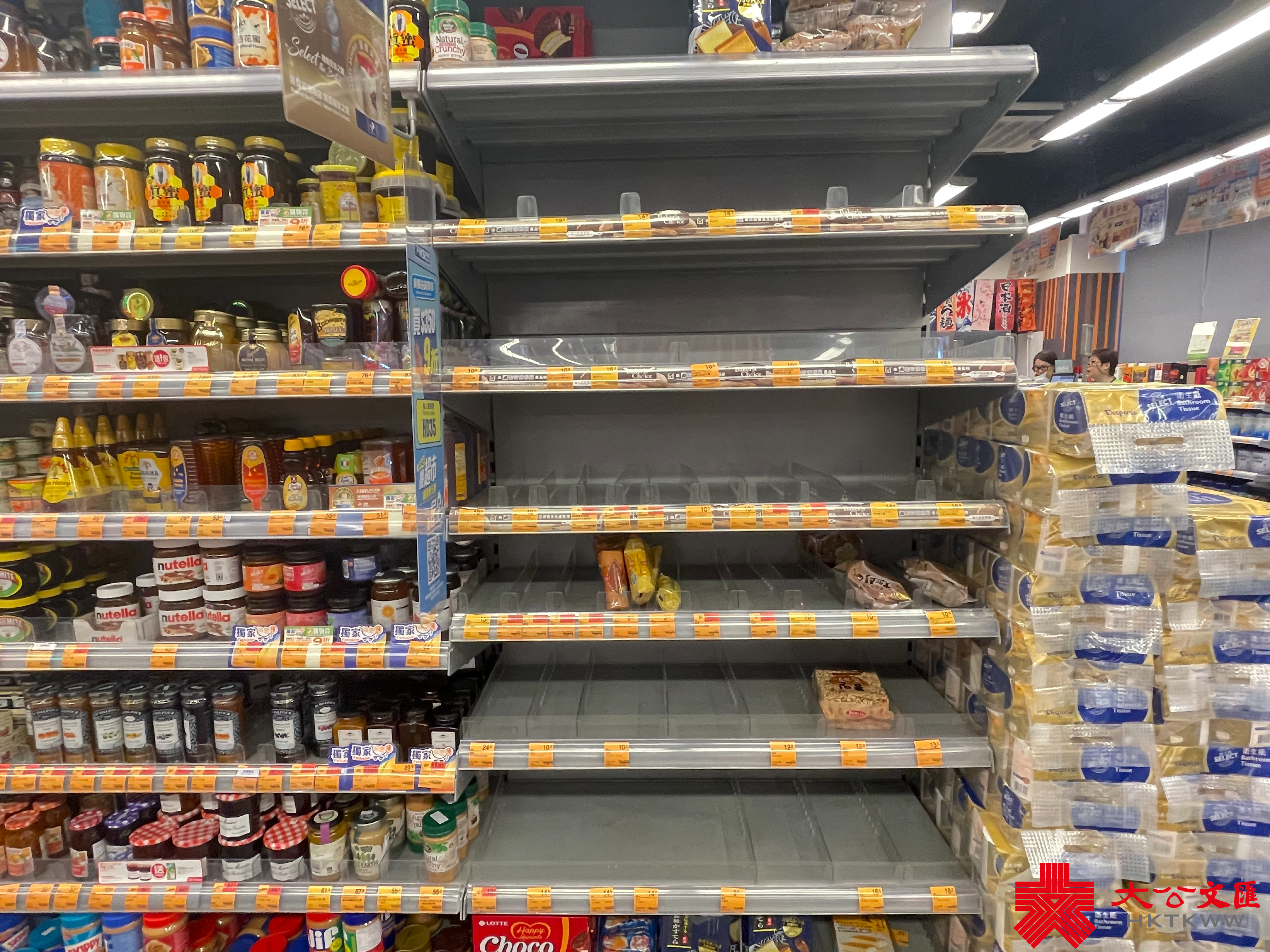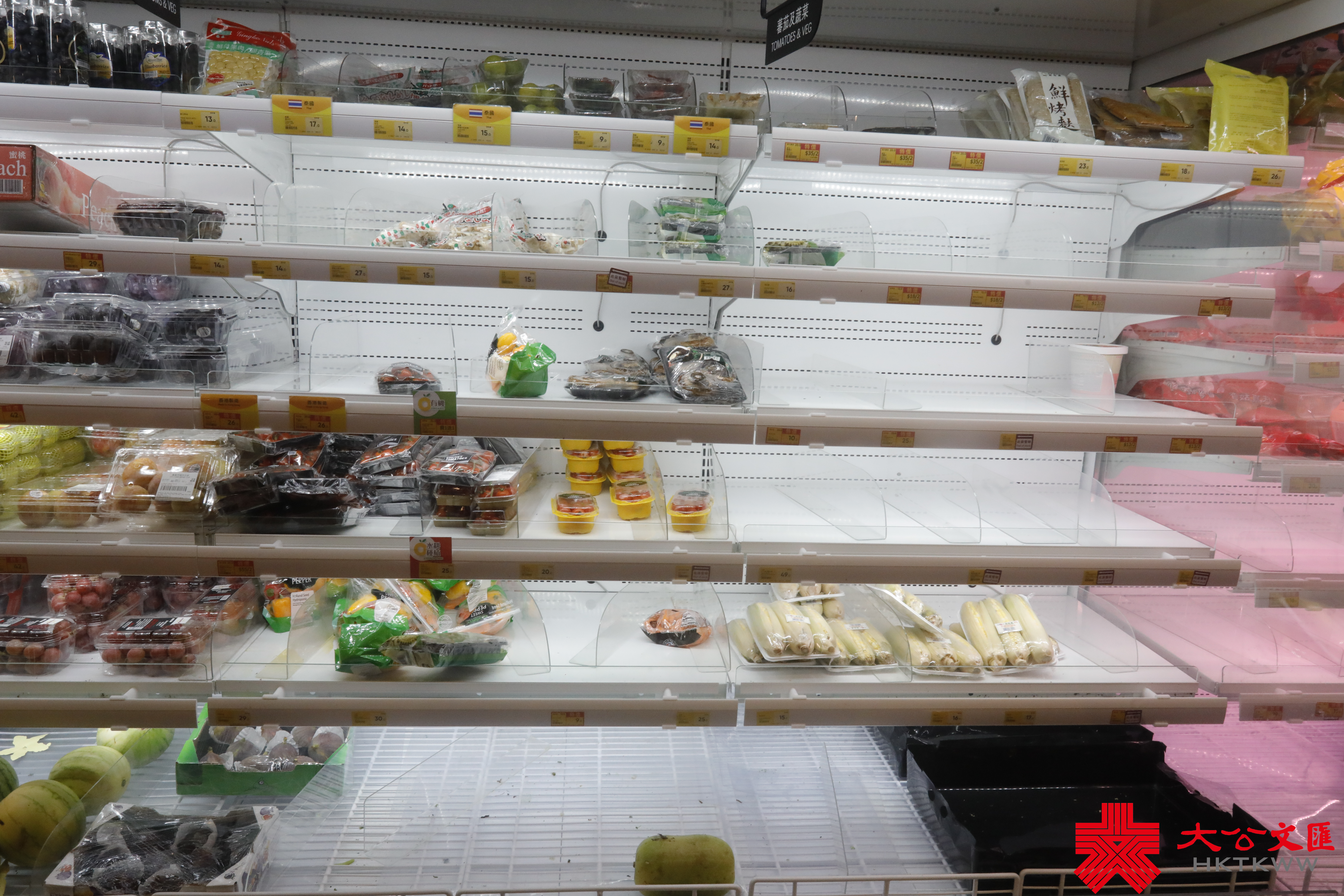 大公文匯全媒體報道,颱風蘇拉明日(9月1日)將會相當接近本港,對本港構成威脅。天文台宣布,會在明日凌晨2時至5時改發八號烈風或暴風信號。記者今日(8月31日)來到超市,發現新鮮蔬菜、肉類和蛋類最搶手。下午6時30分許,麵包貨架和冰鮮肉貨架已空空如也,蔬菜亦僅有少量供選擇,冷凍薄餅、即食麵等都是「市民優選」,排隊結賬的市民也需排長龍。