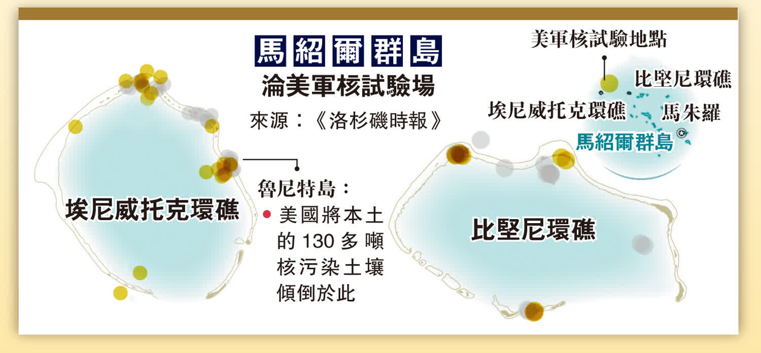 •美軍引爆了25枚核彈,威力最大的是1954年3月1日引爆的「喝彩城堡」氫彈,其破壞力相當於1000枚在日本廣島投下的原子彈。當地居民出現皮膚灼傷、脫髮等症狀,不少人患上甲狀腺癌等惡疾。當地生態環境亦遭到嚴重破壞,大量魚類死亡、珊瑚白化。