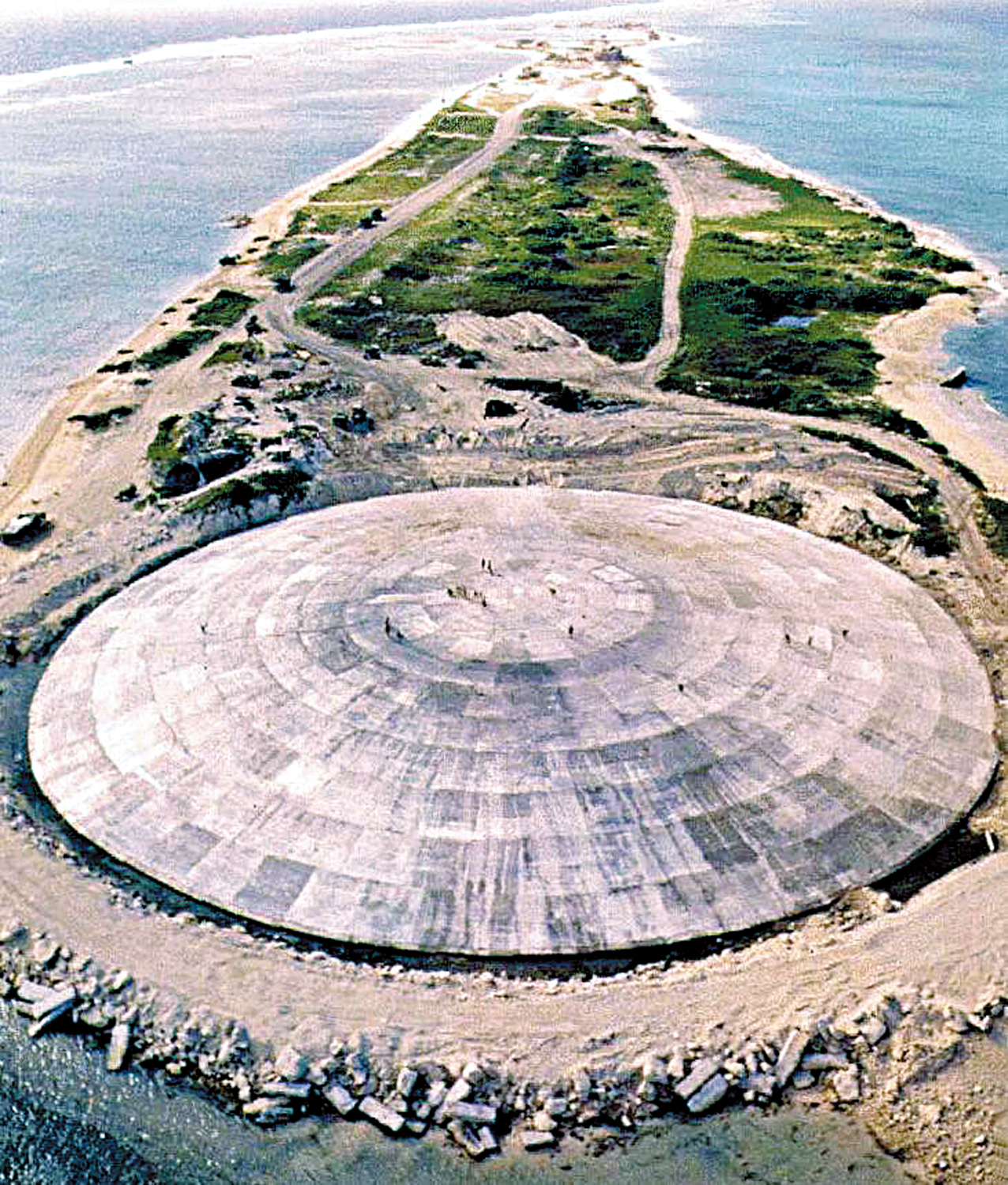 •美軍在馬紹爾群島魯尼特島上建造的巨大穹頂下不僅埋着來自美國本土的核污染土壤,還有核試驗產生的超過7萬立方米放射性廢棄物。美國能源部承認,這裏的放射性物質發生洩漏,進入海洋,但聲稱洩漏的劑量「不算危險」。