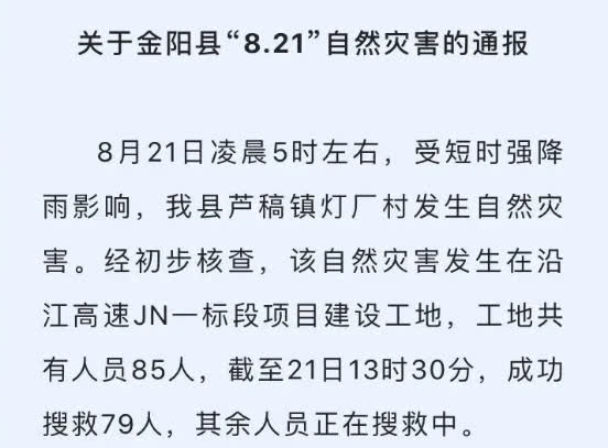 經初步核查,該自然災害發生在沿江高速JN一標段項目建設工地,工地共有人員85人,截至21日13時30分,成功搜救79人,其餘人員正在搜救中。