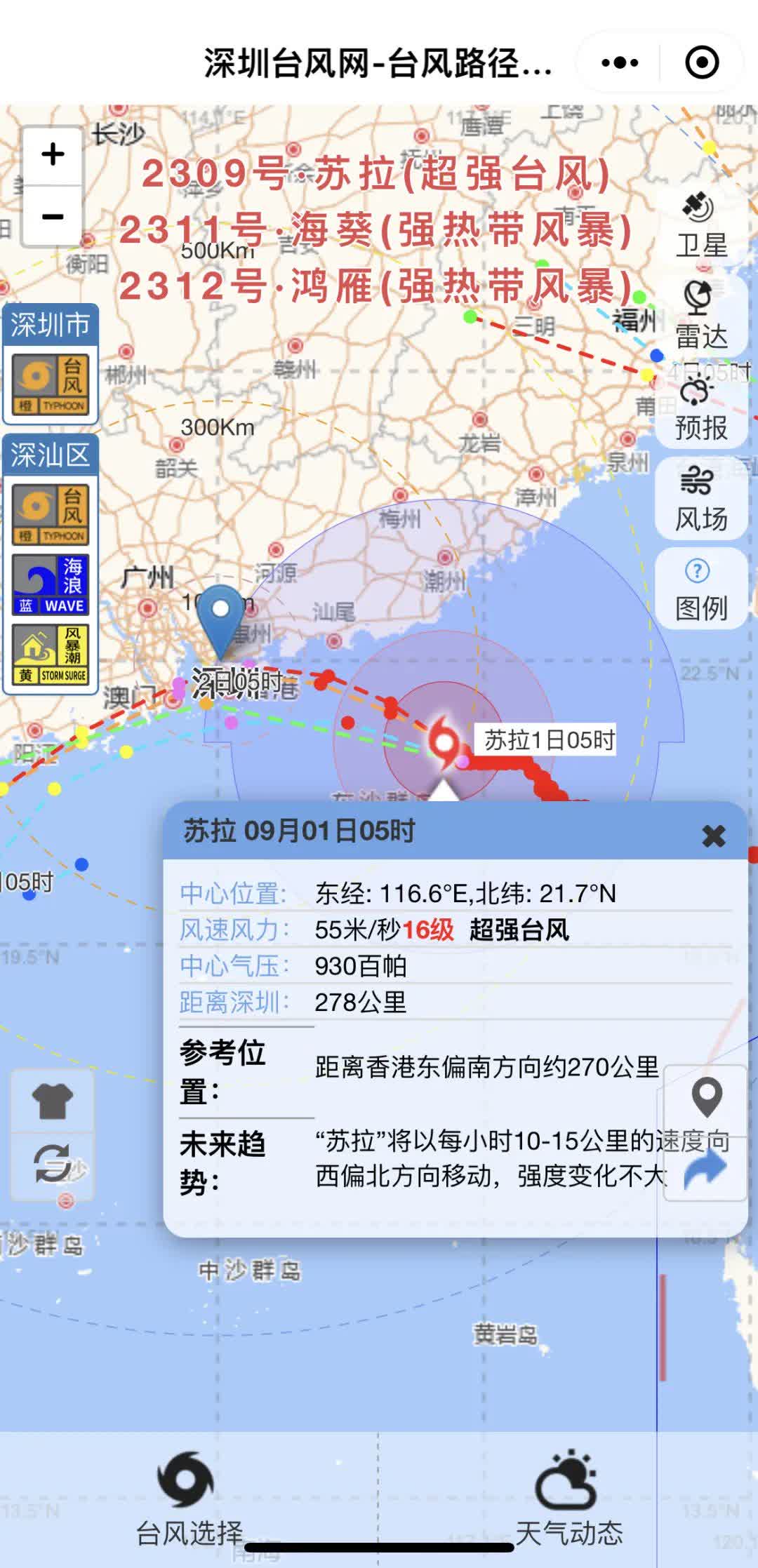 今年第9號颱風「蘇拉」(超強颱風級)9月1日06時位於深圳東南方約268公里的海面上,中心附近最大風力16級(55米/秒),中心最低氣壓930百帕。