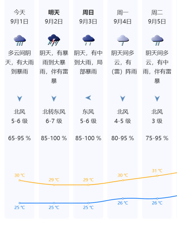 全市(含深汕)1 日午後風雨明顯加大,有暴雨到大暴雨,局部特大暴雨,並伴有最大陣風陸地 10-12 級,沿海、高地和海區 12-14 級。