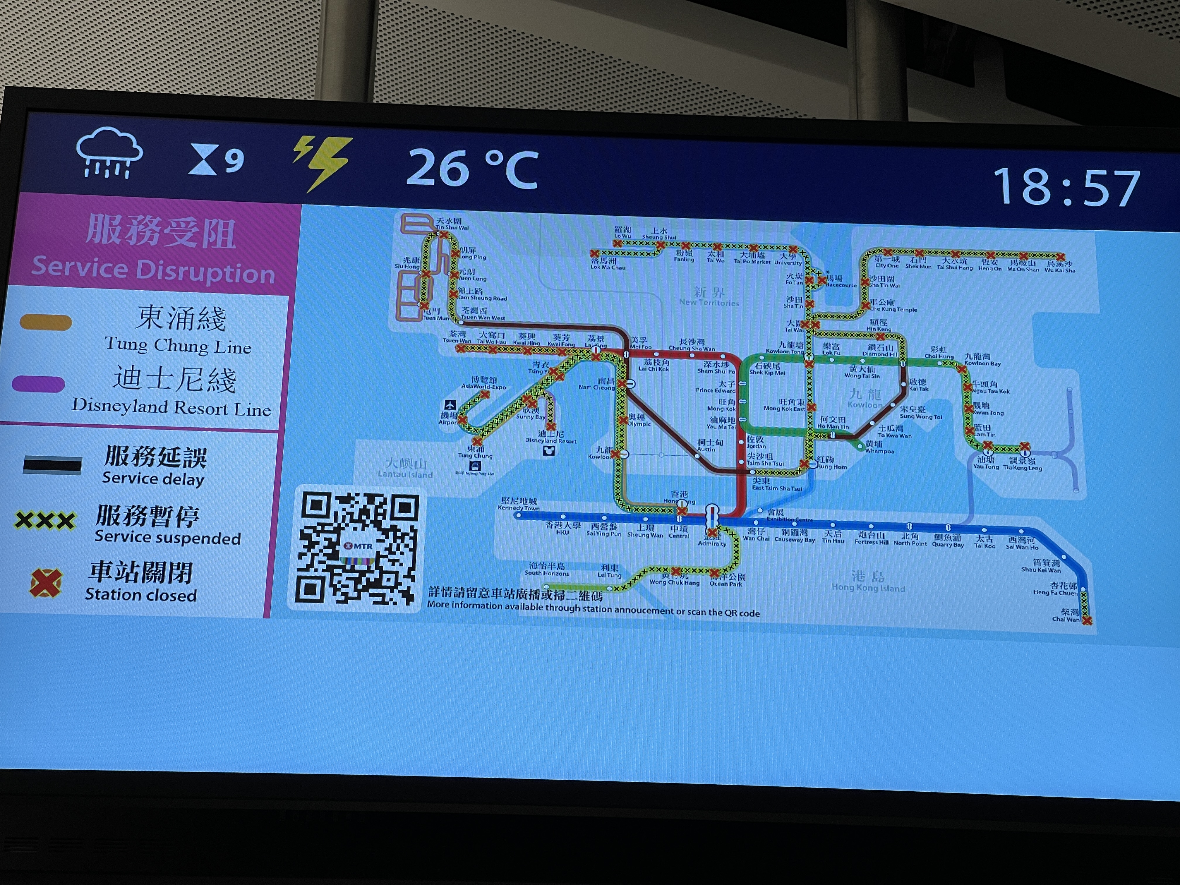 港鐵表示,基於安全考慮,當9號信號發出後,港鐵會即時暫停所有露天路段的港鐵列車和輕鐵服務;至於地底路段,則會維持有限度服務。