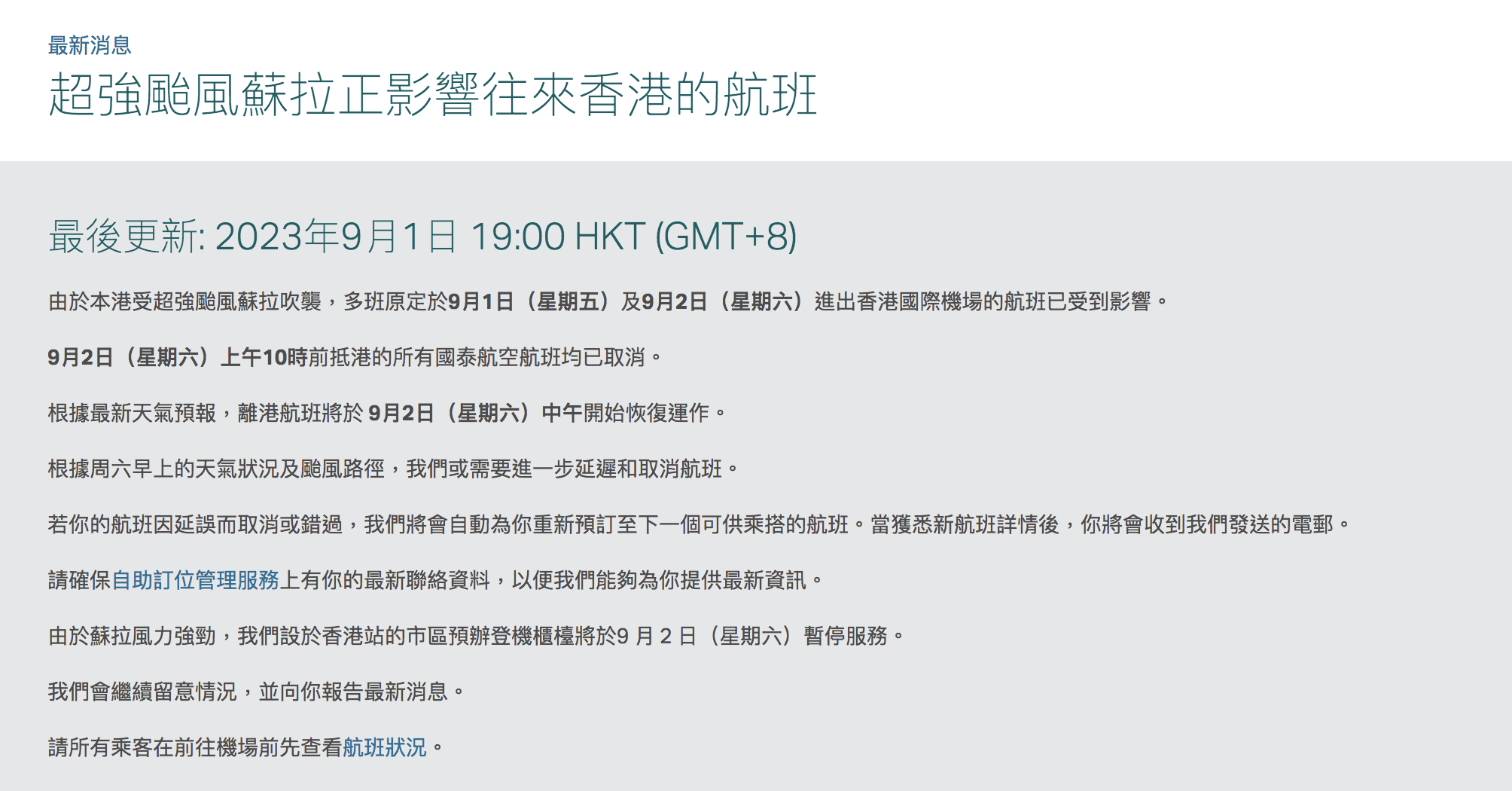 大公文匯全媒體報道,國泰航空表示,由於本港受超強颱風蘇拉吹襲,明日(2日)上午10時前抵港的所有國泰航空航班均已取消,離港航班將於明日中午開始恢復運作。國泰指,根據明早的天氣狀況及颱風路徑,或需要進一步延遲和取消航班。