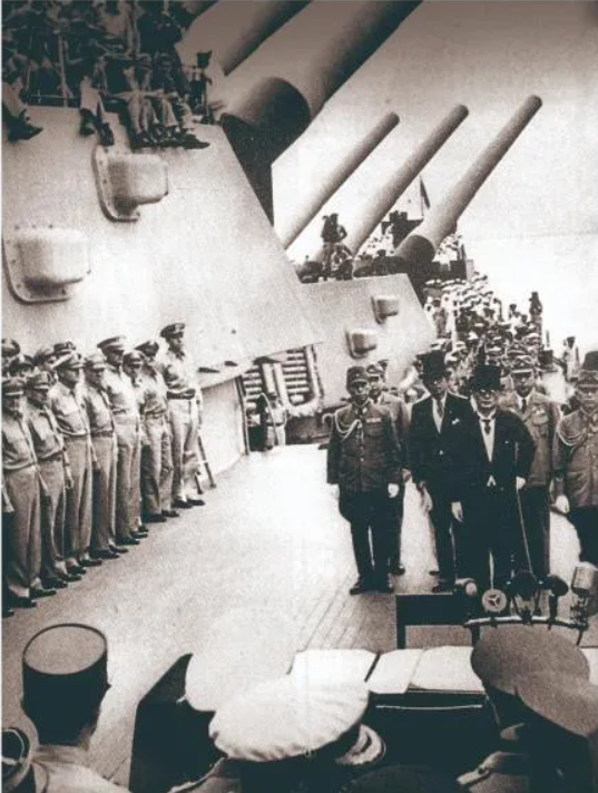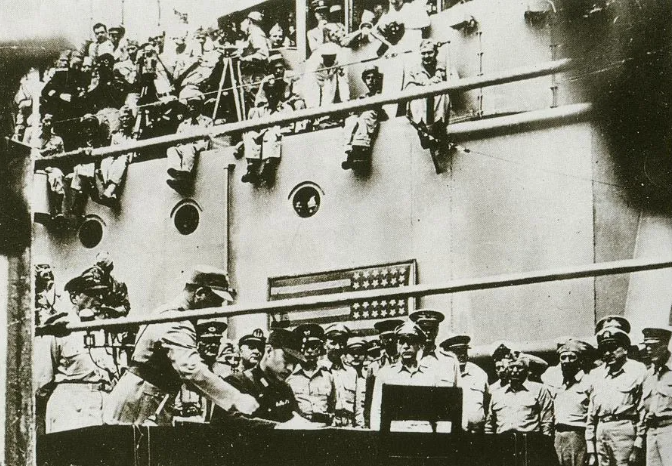 上層甲板上熱鬧的外交場面漸漸結束了。聯合國代表團在簽字桌靠裡的一面列隊靜立。以徐永昌將軍為首的五十位海軍將領和五十位陸軍將領,也分別排列在預先安排好的位置上。這時有人說,日本代表團將到。我急急翹首望去,只見一艘小艇正向軍艦右舷鐵梯駛來。不久,一位美國軍官領先,日本人隨後,陸續從出入口來到主甲板。入口處那一小隊水兵向美國軍官敬禮後,即放下手立正。樂隊寂然。日本代表團外相重光葵在前,臂上掛着手杖,一條真腿一條假腿,走起路來一蹺一拐,登梯時有人扶他。他頭上戴着大禮帽,身穿大禮服,登上上層甲板就把帽子除了。梅津美治郎隨後,一身軍服,重步而行,他們一共十一個人,到上層甲板後,即在簽字桌向外的一面,面對桌子列成三行,和聯合國代表團隔桌而立。這時,全艦靜悄悄一無聲息,只有高懸的旗幟傳來被海風吹拂的微微的獵獵聲。重光一腿失於淞滬戰爭後,一次在上海虹口閱兵時,被一位朝鮮志士尹奉告投擲一枚炸彈炸斷。梅津是前天津日本駐屯軍司令,著名的《何梅協定》日方簽訂人。他們都是中國人民的熟人,當年在我們的國土上不可一世,曾幾何時,現在在這裡重逢了。