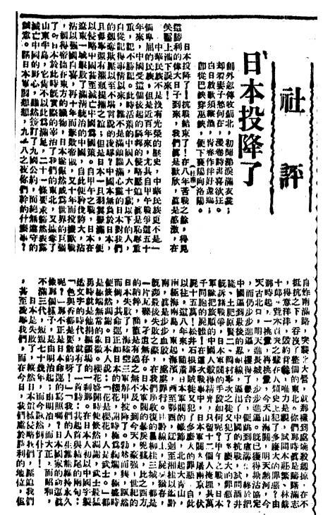 這水兵的話是對的,我們將來也要講給子孫聽,代代相傳。可是,我們別忘了百萬將士流血成仁,千萬民眾流血犧牲,勝利雖最後到來,代價卻十分重大。我們的國勢猶弱,問題仍多,需要真正的民主團結,才能保持和發揚這個勝利成果。否則,我們將無面目對子孫後輩講述這一段光榮歷史了。舊恥已湔雪,中國應新生。