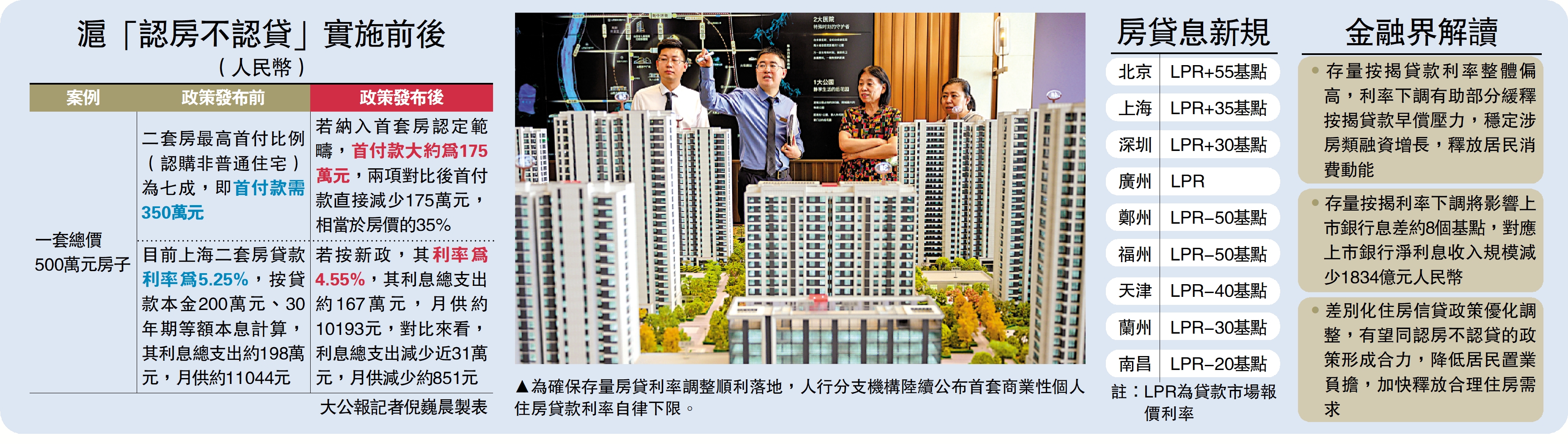 (大公報記者 蔣去悄)因應中國人民銀行、金融監管總局周四發布的新規,要求降低存量首套住房商業性個人住房貸款利率。為支持政策推行,人行多個分行昨日公布首套商業性個人住房貸款利率下限,其中北京現行下限為相應期限的貸款市場報價利率(LPR)加55個基點,上海為LPR加35個基點,深圳為LPR加30個基點,現行全國利率下限為LPR減20個基點。分析認為,存量按揭貸款利率整體偏高,政策落地有助緩解早償壓力,改善居民置業情緒。