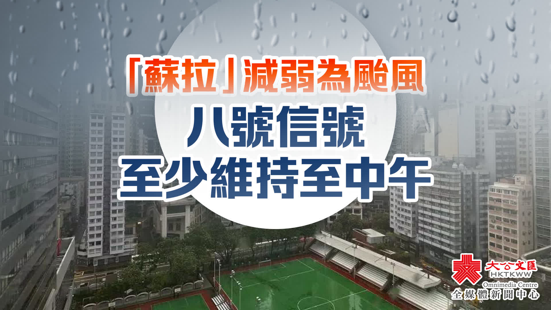 大公文匯全媒體報道,八號東南烈風或暴風信號,現正生效,「蘇拉」已減弱為颱風。天文台今日(2日)上午7時45分表示,「蘇拉」繼續遠離本港,但本港多處仍受烈風影響,蘇拉的雨帶仍為本港帶來狂風大驟雨。八號烈風或暴風信號會至少維持至中午,市民切勿鬆懈防風措施。