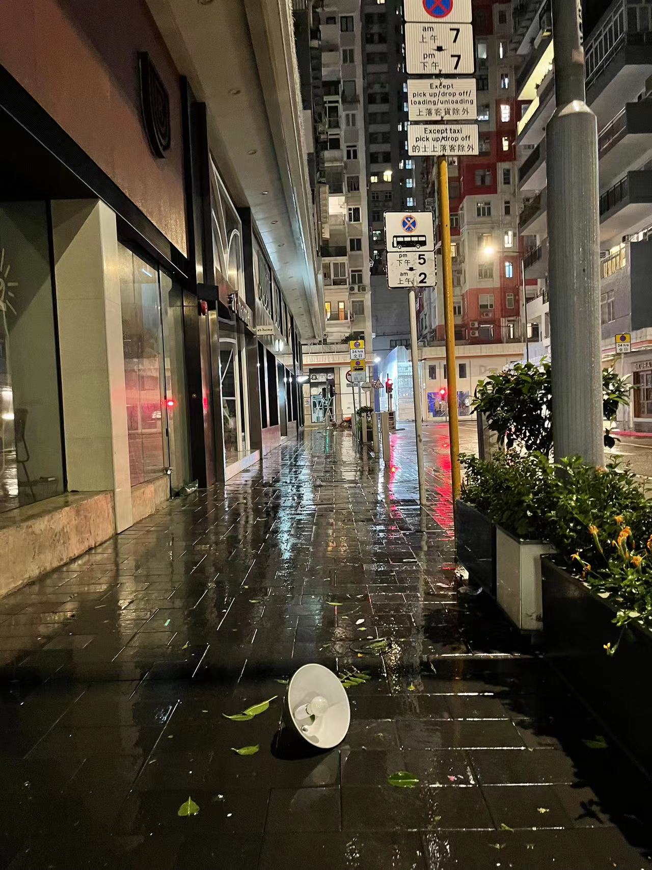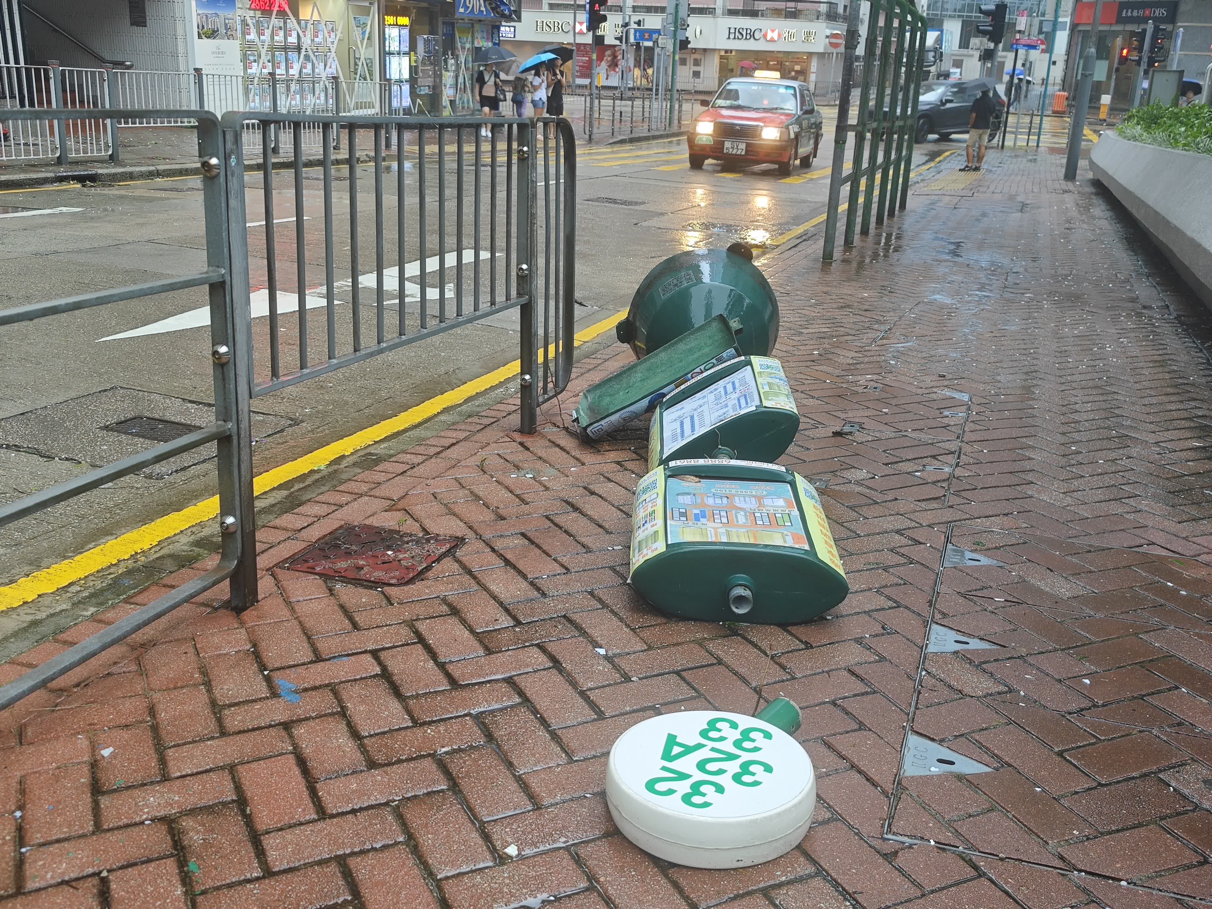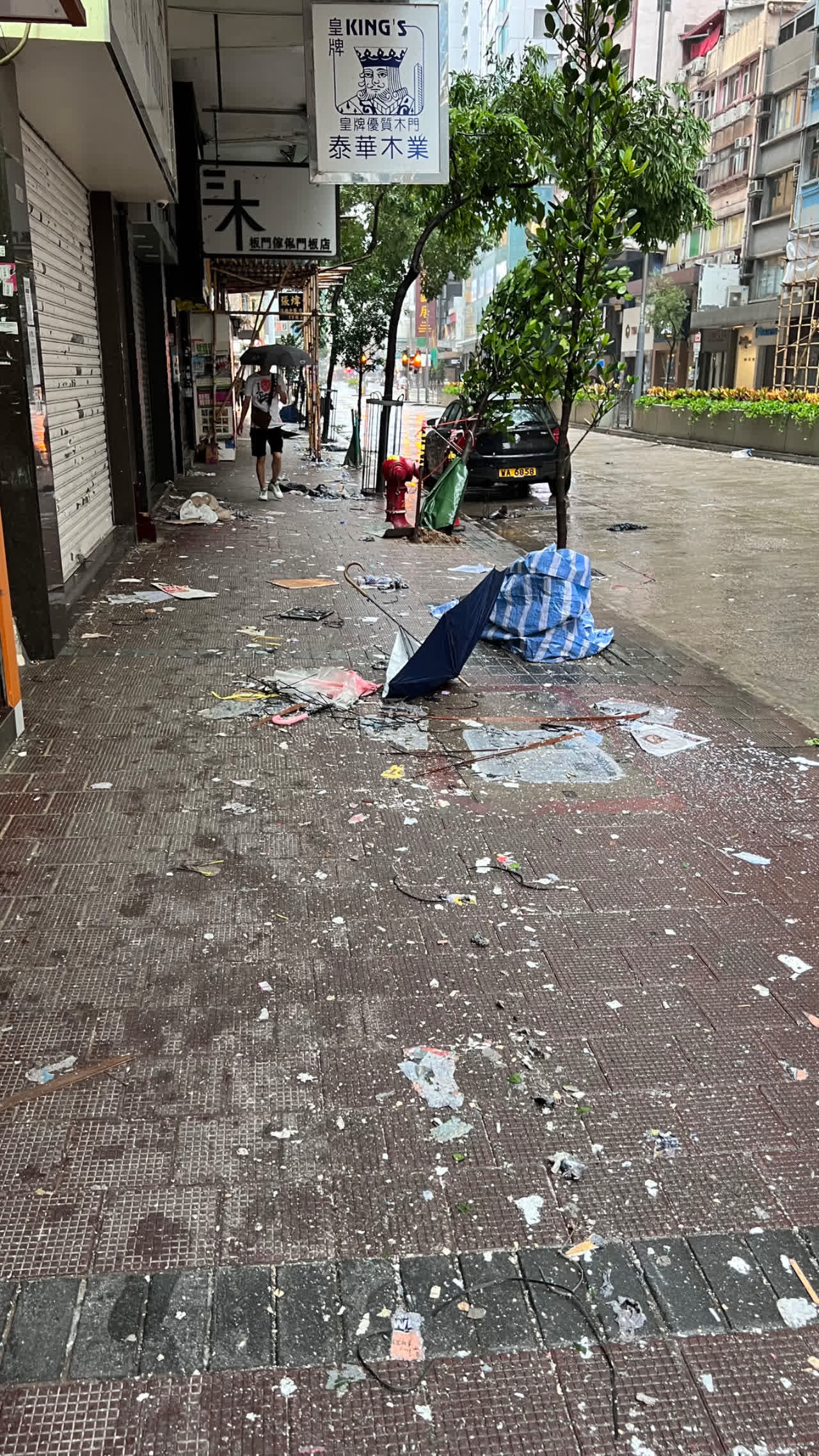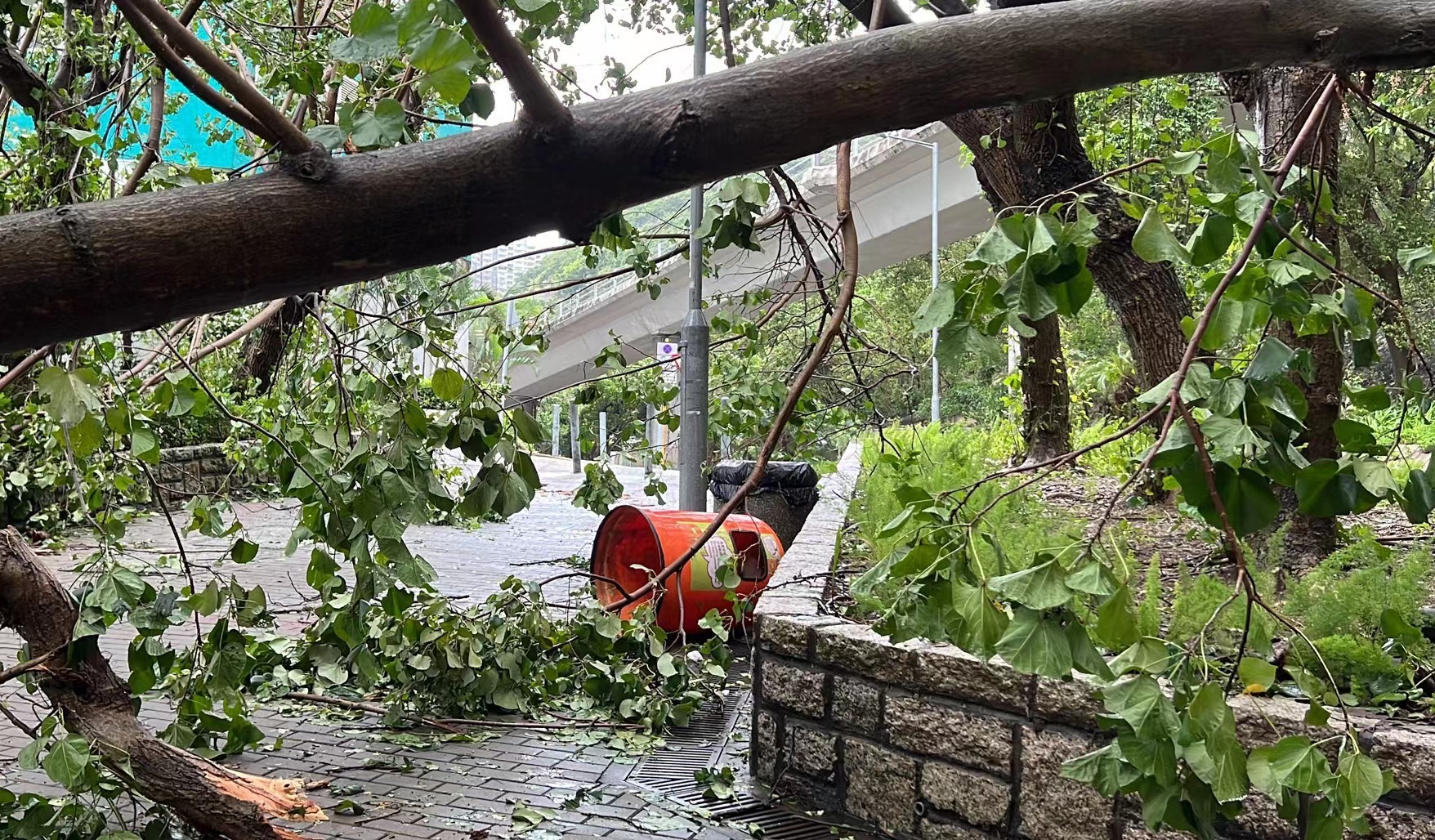 香港仔海旁感受到「蘇拉」的「辣手摧樹」之力,大量樹木被攔腰吹斷,一片狼藉。甚至有垃圾桶被吹至「身首異處」,行人皆需繞行。