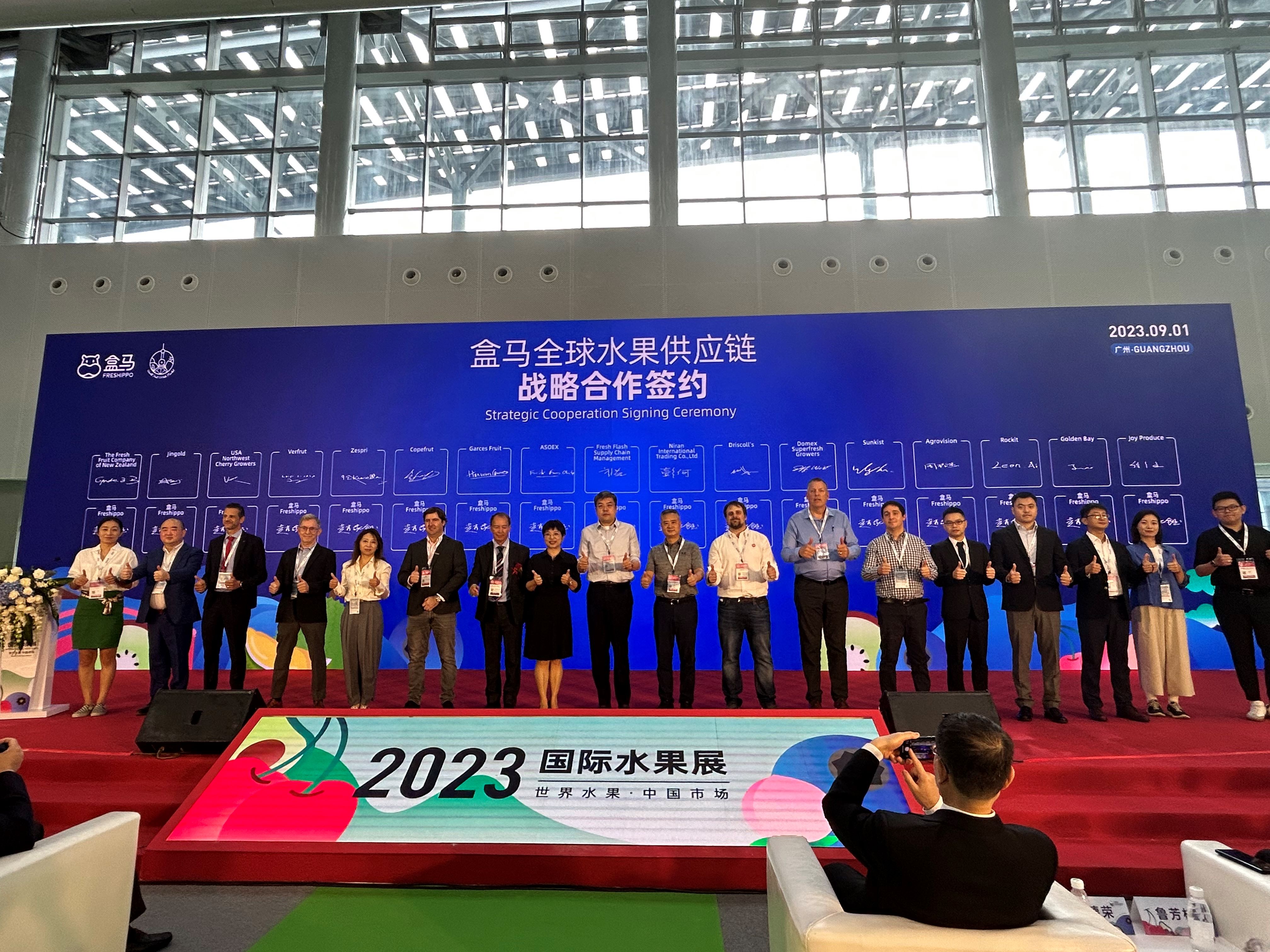 此次國際水果展上,盒馬與全球17家水果巨頭達成戰略合作,來自智利的第一大車釐子種植出口公司Garces Fruit吉制、中國最大的榴槤分銷商Niran International Company、全球最大的水果蔬菜類合作社Sunkist、智利水果出口商協會、美國西北車釐子種植商協會、東航物流生鮮港等分別與盒馬現場簽訂深度合作協議。