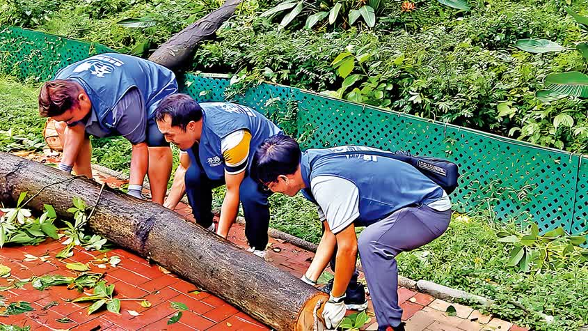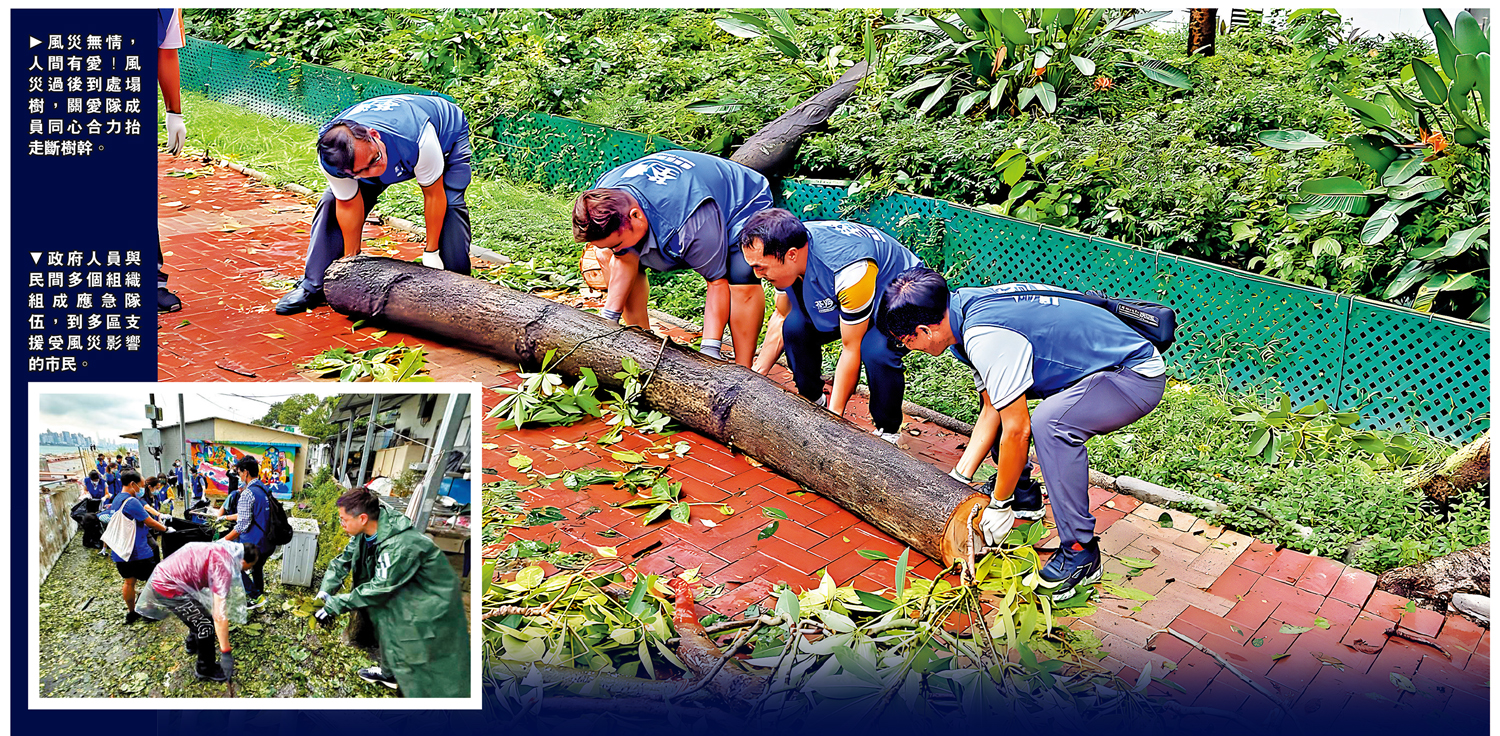 (大公報 記者 吳俊宏 黃釔淼)超強颱風「蘇拉」襲港,特區政府全方位動員,多個政府部門及不同機構單位人員在惡劣天氣下迅速行動,築牢香港的「防風牆」。同時,社會各界發揮獅子山下守望相助的精神,自發加入防風、善後和復常的行列。政團社團組織大量義工隊,奔走各大街小巷,清障搶險,打掃衞生,協同政府部門救急扶危,令風後香港社會迅速復常。