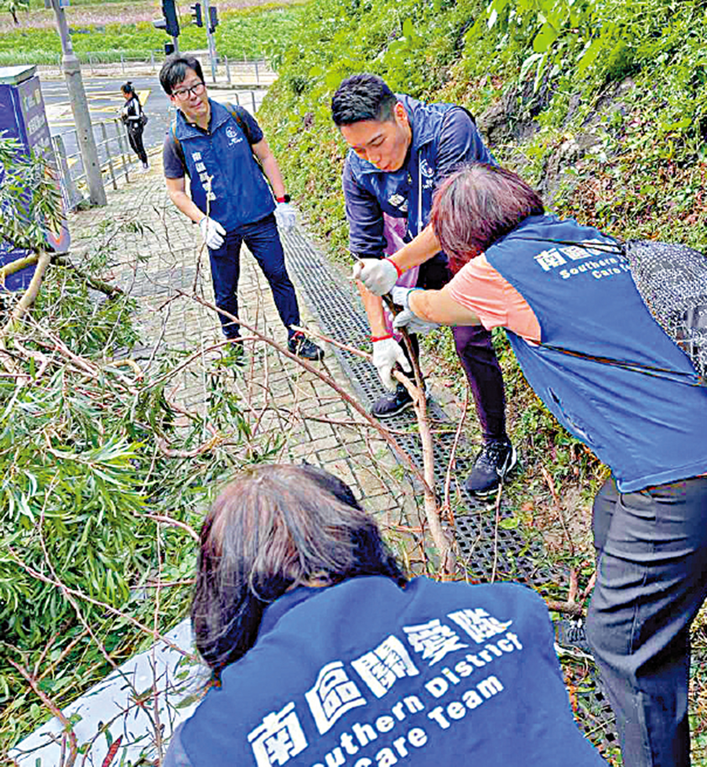 面對全港地區都出現設施受損、水浸、樹木倒塌等情況,全港各界社團義工紛紛自發行動起來,齊心協力搬移塌下的樹幹樹枝,迅速清理路面的垃圾、雜物,為有需要幫助,以及風暴下受損失的市民及時施以援手,令大家盡快恢復正常生活。