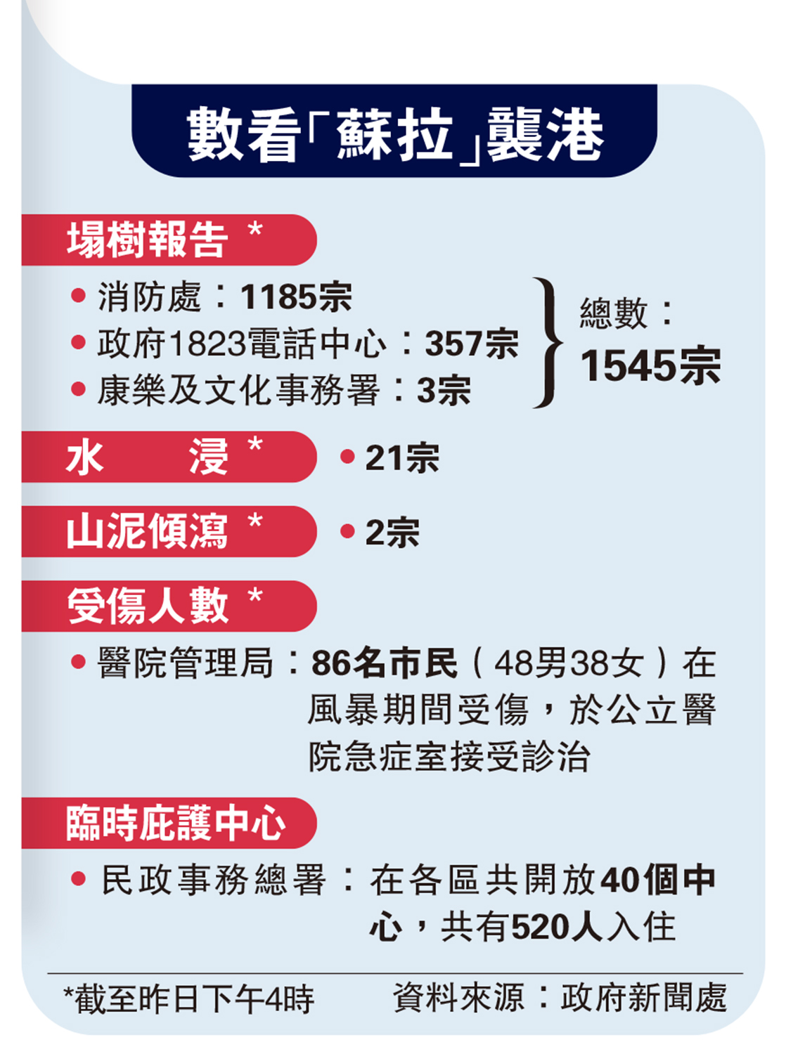 對比2018年的超強颱風「山竹」吹襲期間,香港至少造成458人受傷,另有不少於6萬宗塌樹報告而言,截至昨日下午4點,今次颶風「蘇拉」過境僅錄得86人受傷、1545宗塌樹報告,而且在社會各界合力下,各區塌樹情況迅速被處理,路面交通很快暢通,社會恢復正常。