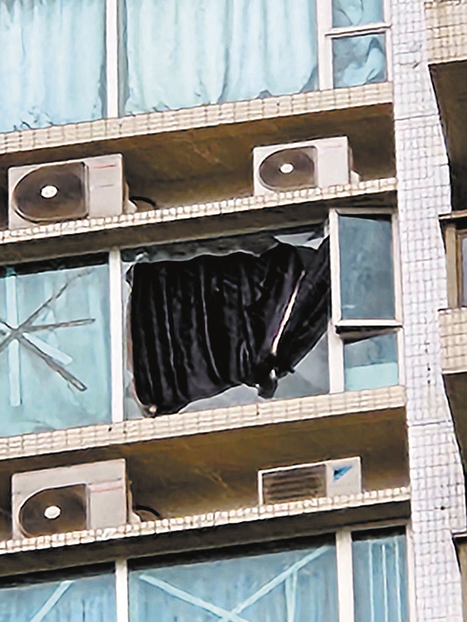 (香港文匯報記者 廣濟)香港時隔5年後再次經歷十號風球洗禮。在「蘇拉」襲港期間,不少住戶反映其樓宇搖搖晃晃,玻璃窗更是一個單位裏最脆弱的地方,歌手蔡卓妍(阿Sa)的豪宅就難抵風雨而出現滲水情況。香港最東南方的將軍澳區成為「爆窗」重災區,原因除了強風造成的共振效應,也和雜物橫飛擊中玻璃有關。香港文匯報記者昨日直擊其中一個爆窗戶,戶主憶述中「流彈」經過仍心有餘悸:「突然之間砰一聲,玻璃窗全部爆裂、碎片滿地,我小腿有幾處被碎片擊中流血。」當時橫風橫雨,戶主徹夜難眠憂心水浸入屋。由於多戶「中招」管理處應接不暇,戶主要用木板自行修理。