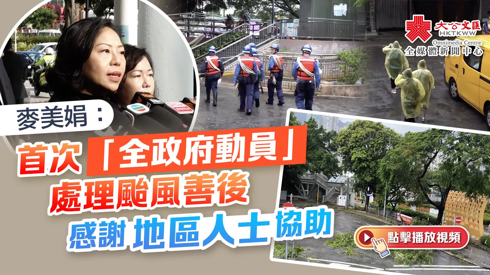 麥美娟說,昨日獲得行政長官李家超批准,首次啟動「全政府動員」級別,進行超強颱風蘇拉襲港後的善後工作。昨日動員約100人,包括法律援助署、差餉物業估價署和工貿署的人員,分別到沙頭角、東涌及鯉魚門進行善後工作,包括協助臨時庇護中心長者返回安老院、幫助街坊移走封閘、沙包,以及清路等。由於大澳的水位昨天還未降低,政府人員今日會繼續到大澳協助善後。