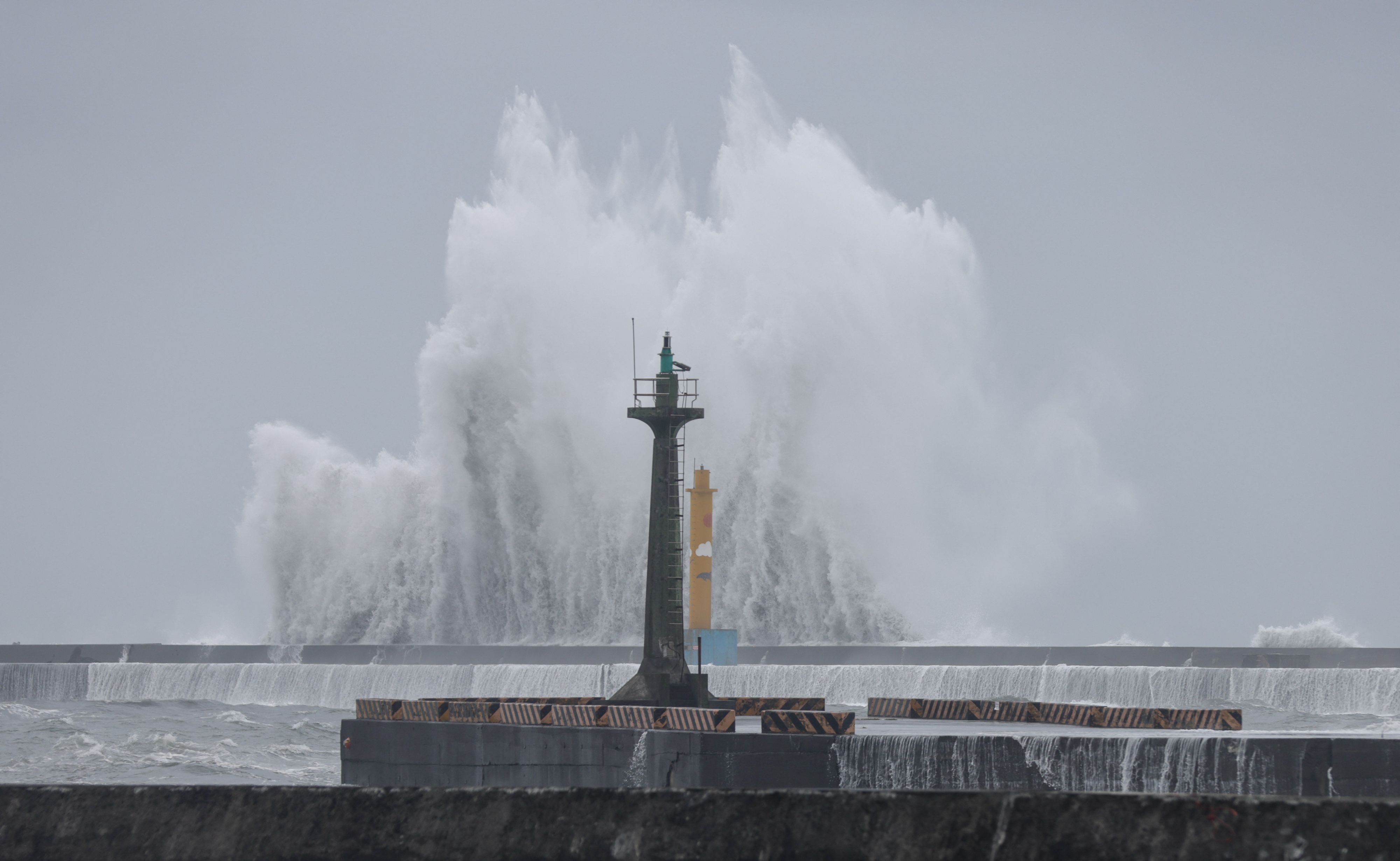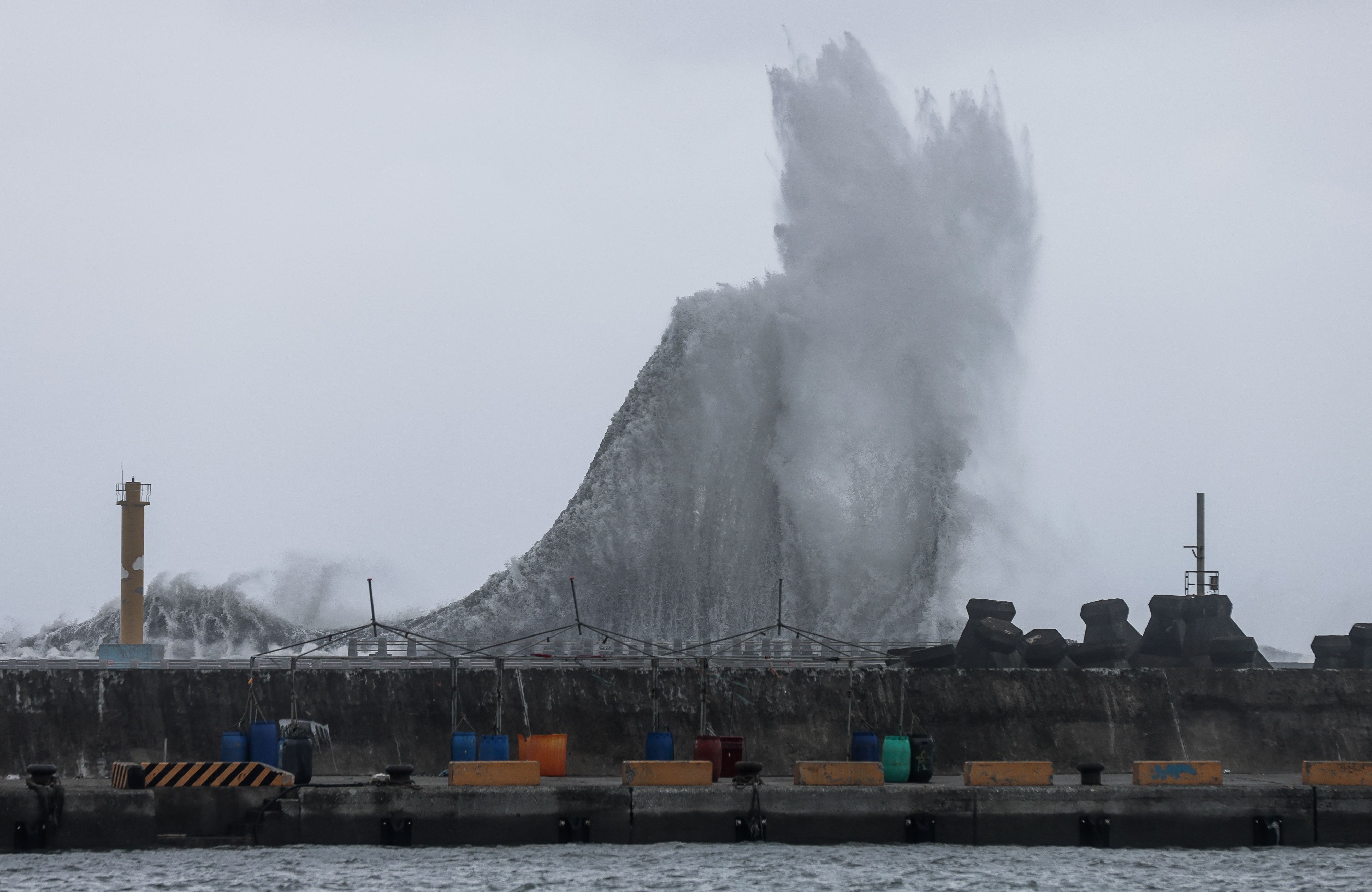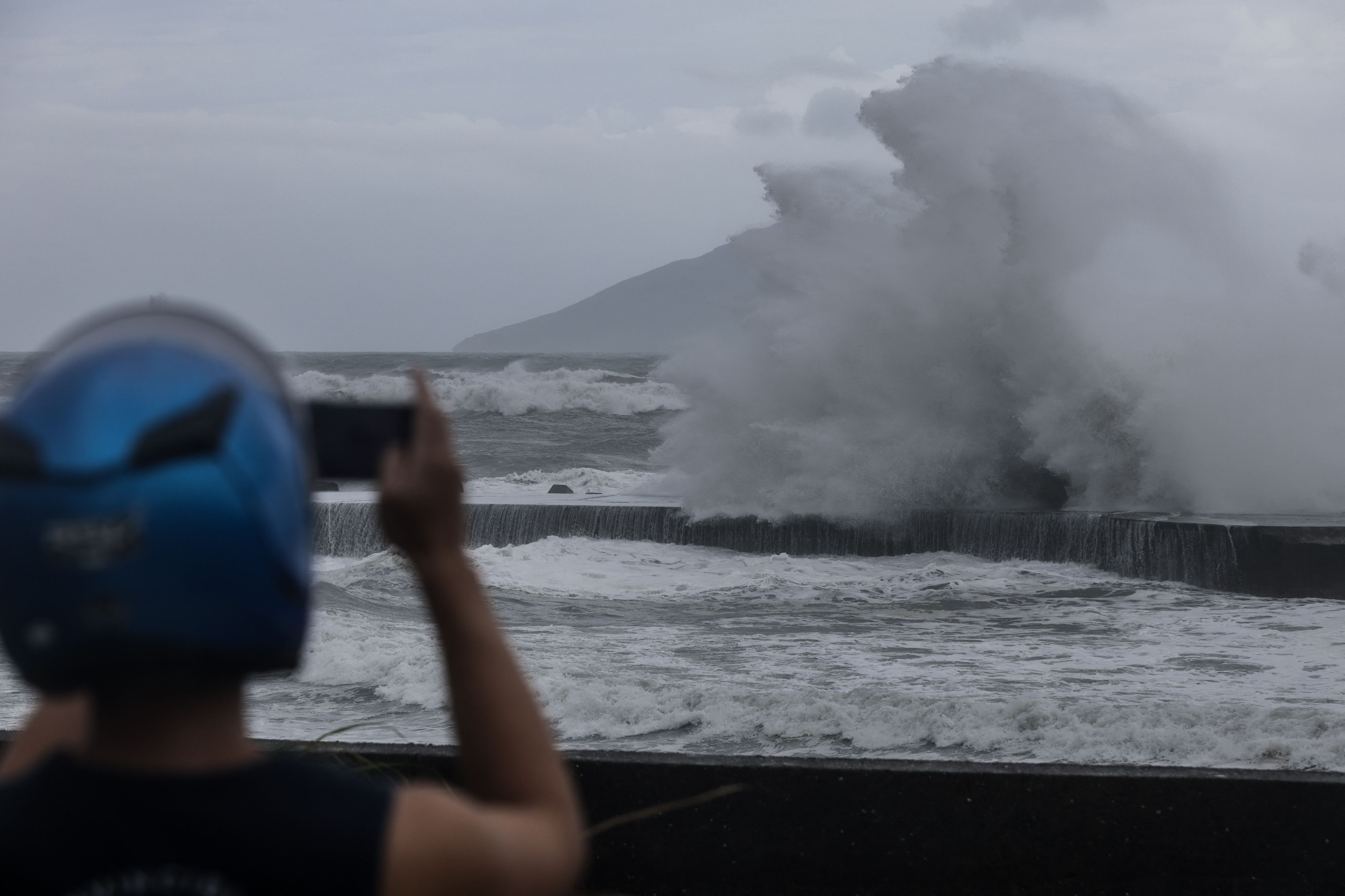 宜蘭沿海區域颱風威力強勁,岸邊掀起滔天巨浪,目測至少有5米高,正不斷拍打上岸。惟橫風橫雨之下,仍有當地居民不肯離開,而是在岸邊圍觀,用手機拍攝巨浪。
